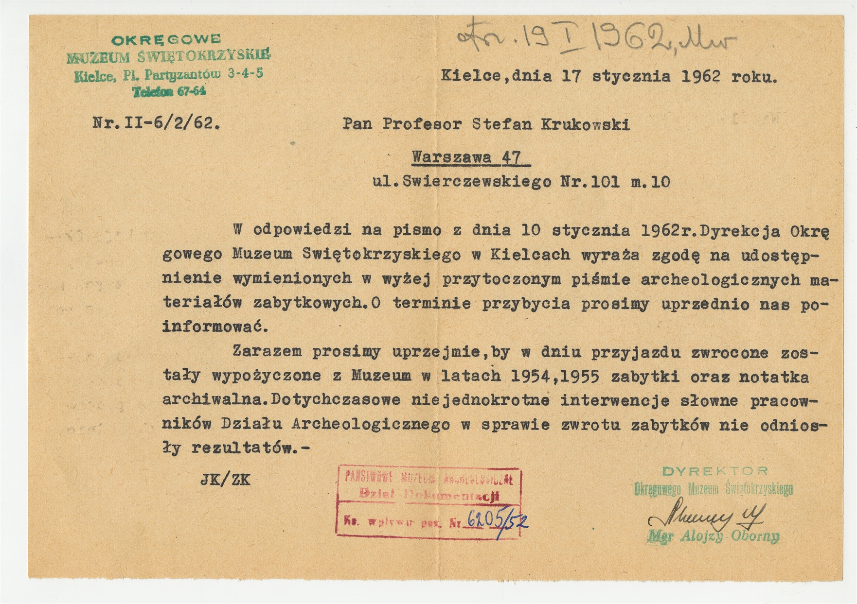 Maszynopis - list Alojzego Obornego dyrektora Muzeum Świętokrzyskiego do Stefana Krukowskiego z dnia 17 stycznia 1962 roku