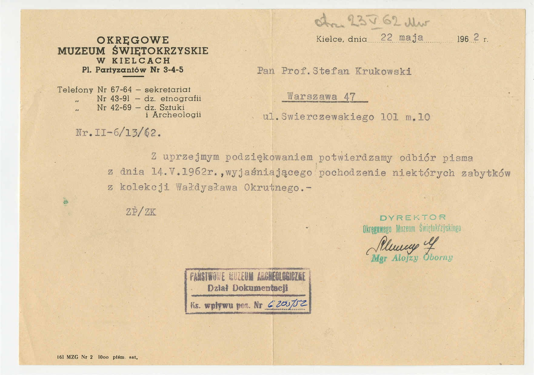 Maszynopis - list Alojzego Obornego dyrektora Muzeum Świętokrzyskiego do Stefana Krukowskiego z dnia 22 maja 1962 roku