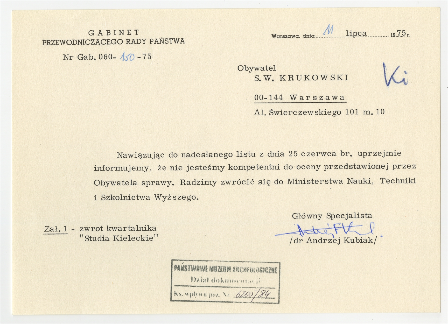 Maszynopis - list Andrzeja Kubiaka Głównego Specjalisty w Gabinecie Przewodniczacego Rady Państwa do Stafana Krukowskiego z dnia 11 lipca 1975 roku