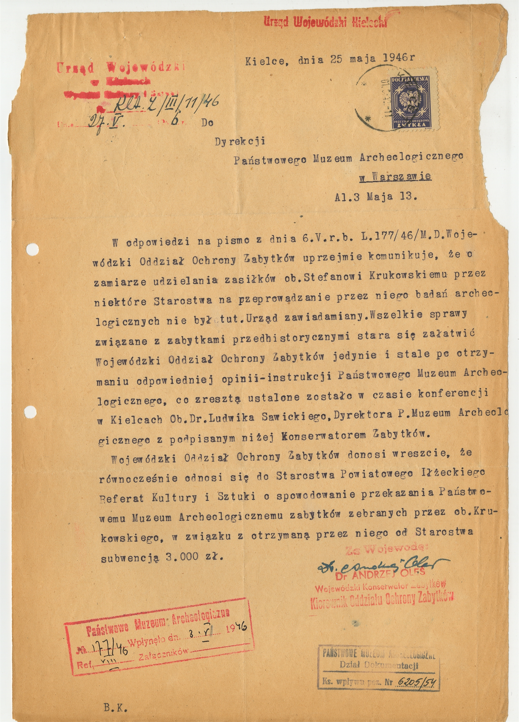 Maszynopis - list Andrzeja Olesia do Dyrekcji Panstwowego Muzeum Archeologicznego w Warszawie z dnia 25 maja 1946 roku