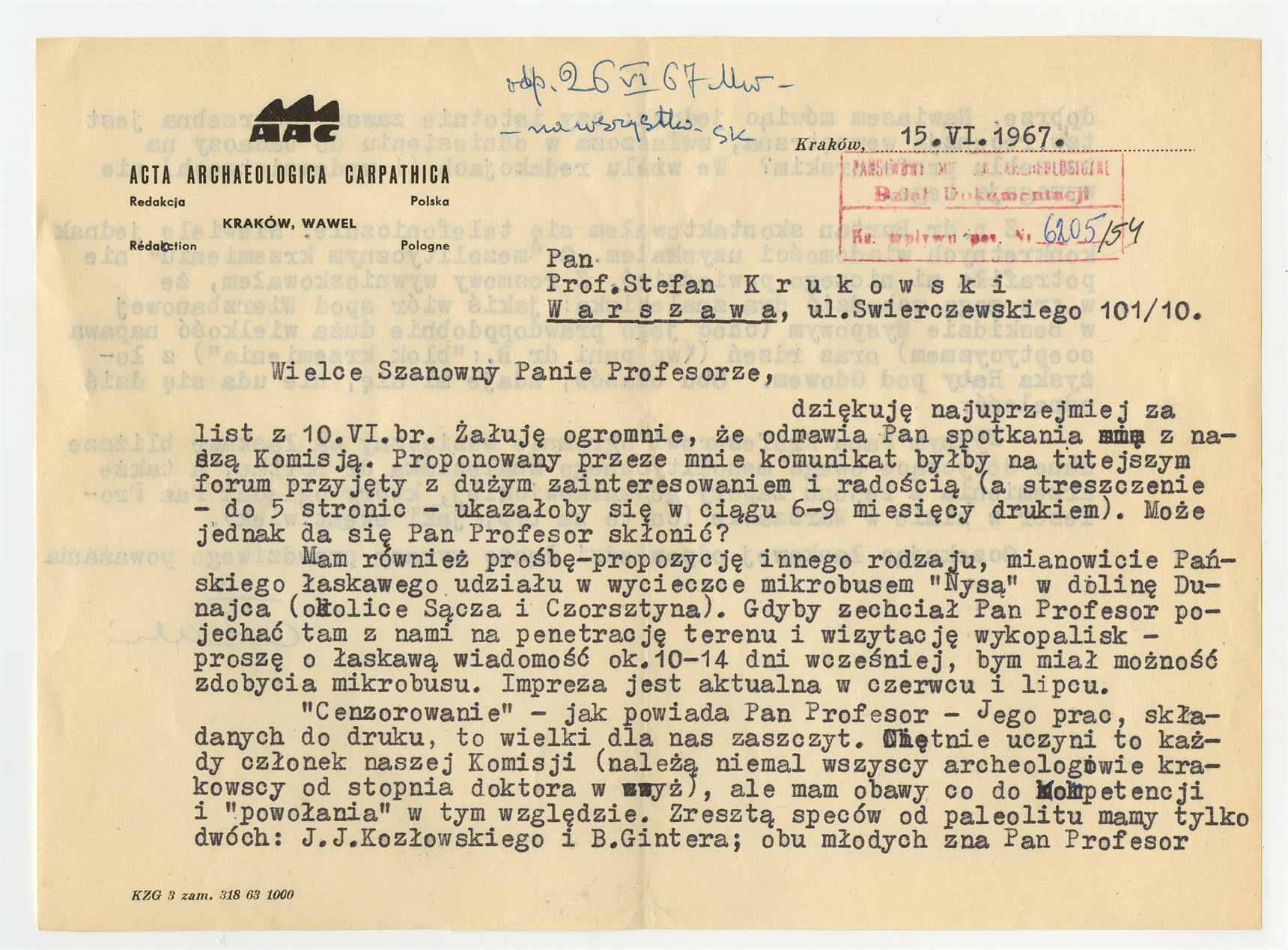 Maszynopis - list Andrzeja Żaki do Stefana Krukowskiego z dnia 15 VI 1967 roku