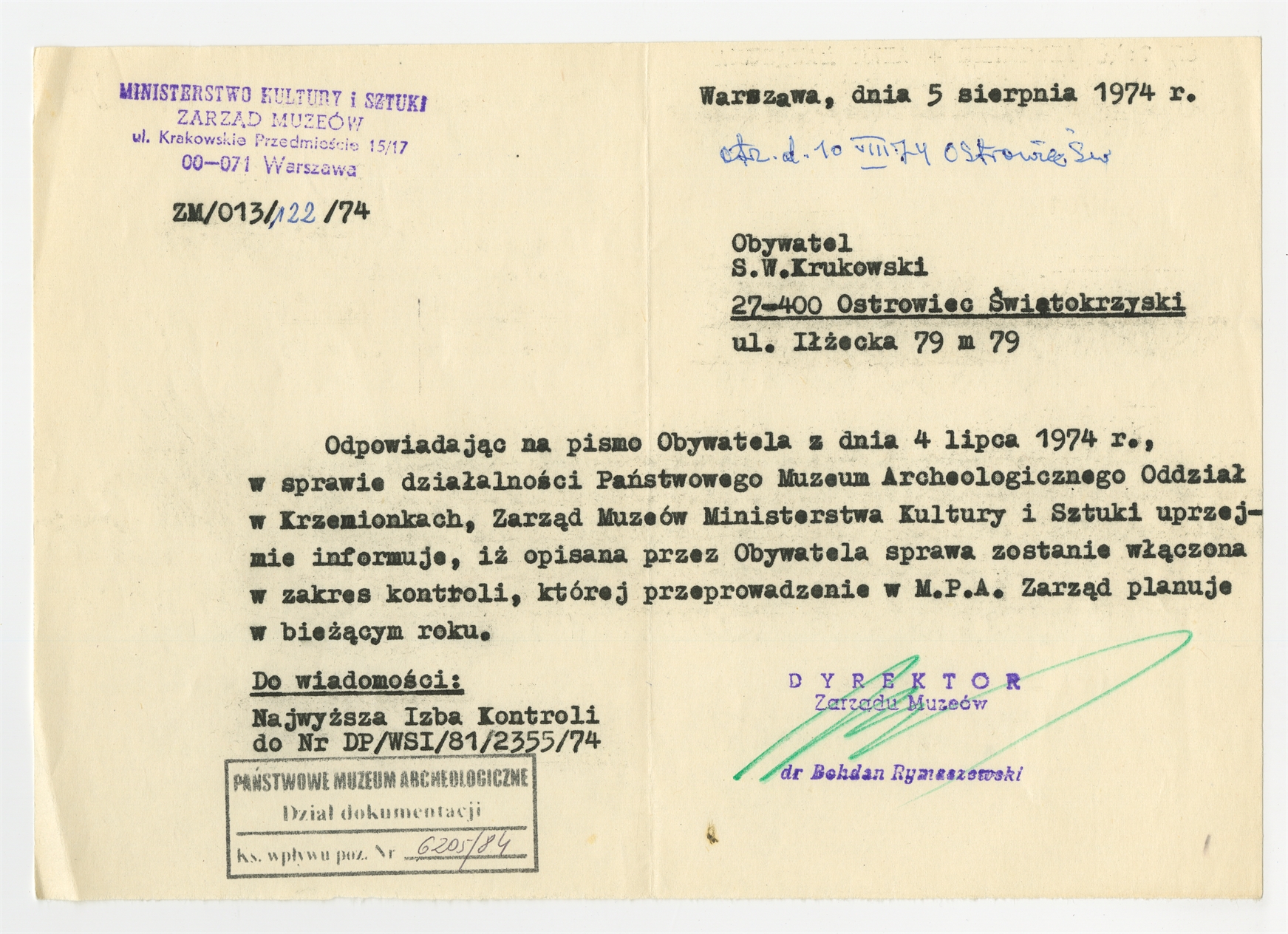 Maszynopis - list B. Rymaszewskiego dyrektora Zarządu Muzeów do Stefana Krukowskiego z dnia 5 sierpnia 1974 roku
