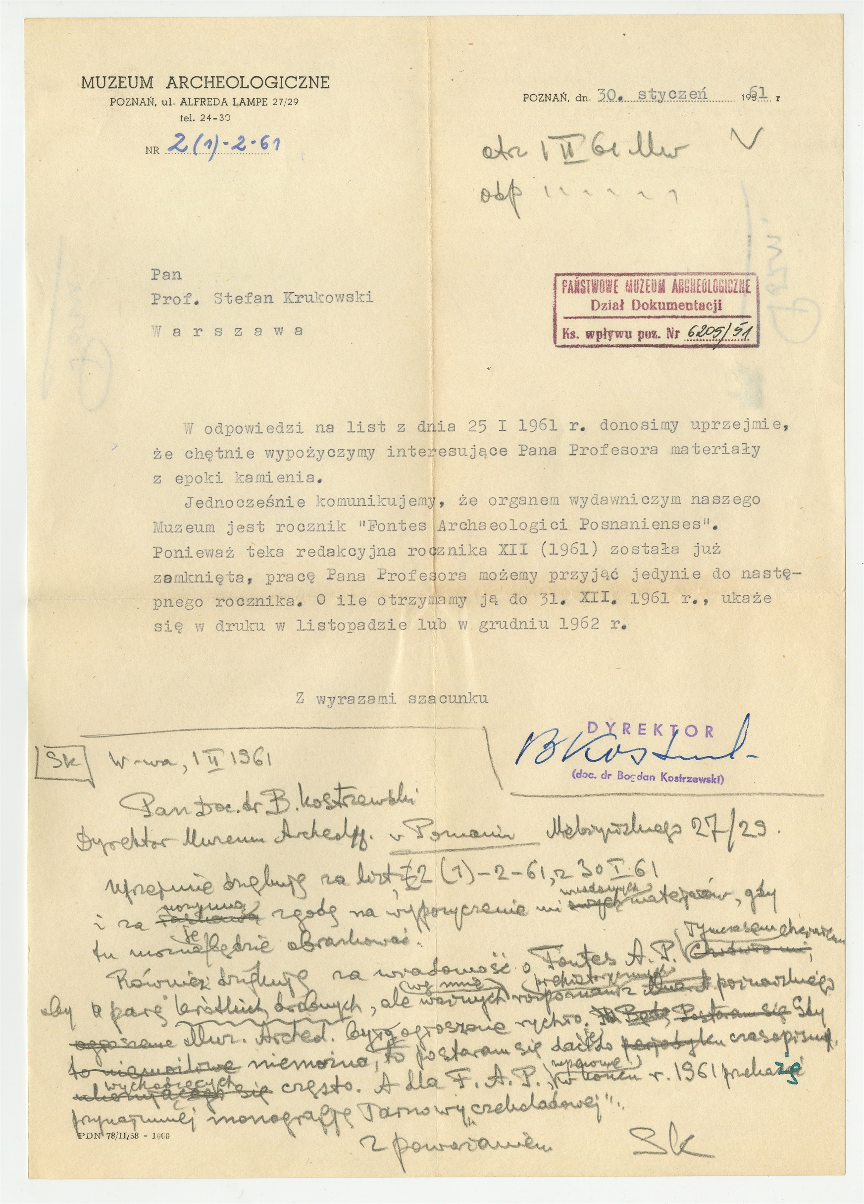 Maszynopis - list Bogdana Kostrzewskiego do Stefana Krukowskiego z dnia 30 stycznia 1961 roku. Na tej samej stronie rękopis - brudnopis odpowiedzi Stefana Krukowskiego na ten list