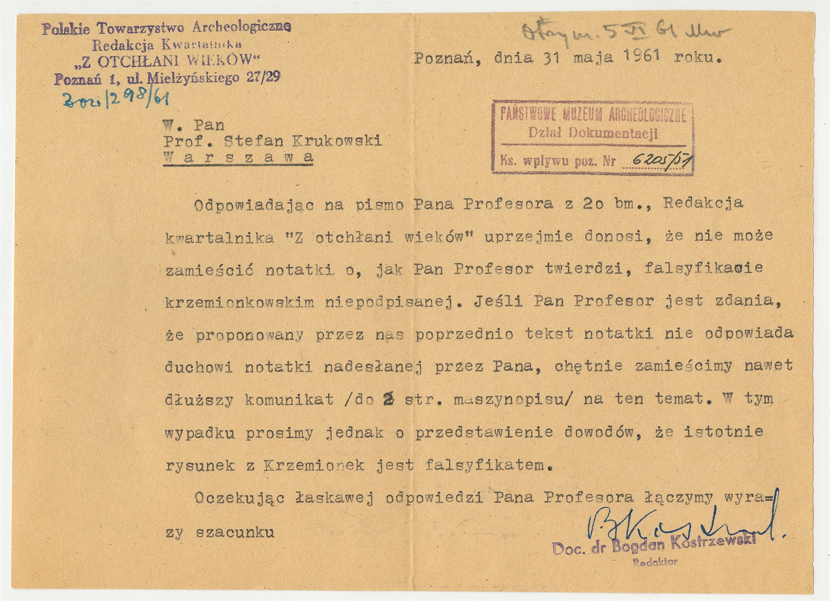 Maszynopis - list Bogdana Kostrzewskiego do Stefana Krukowskiego z dnia 31 maja 1961 roku