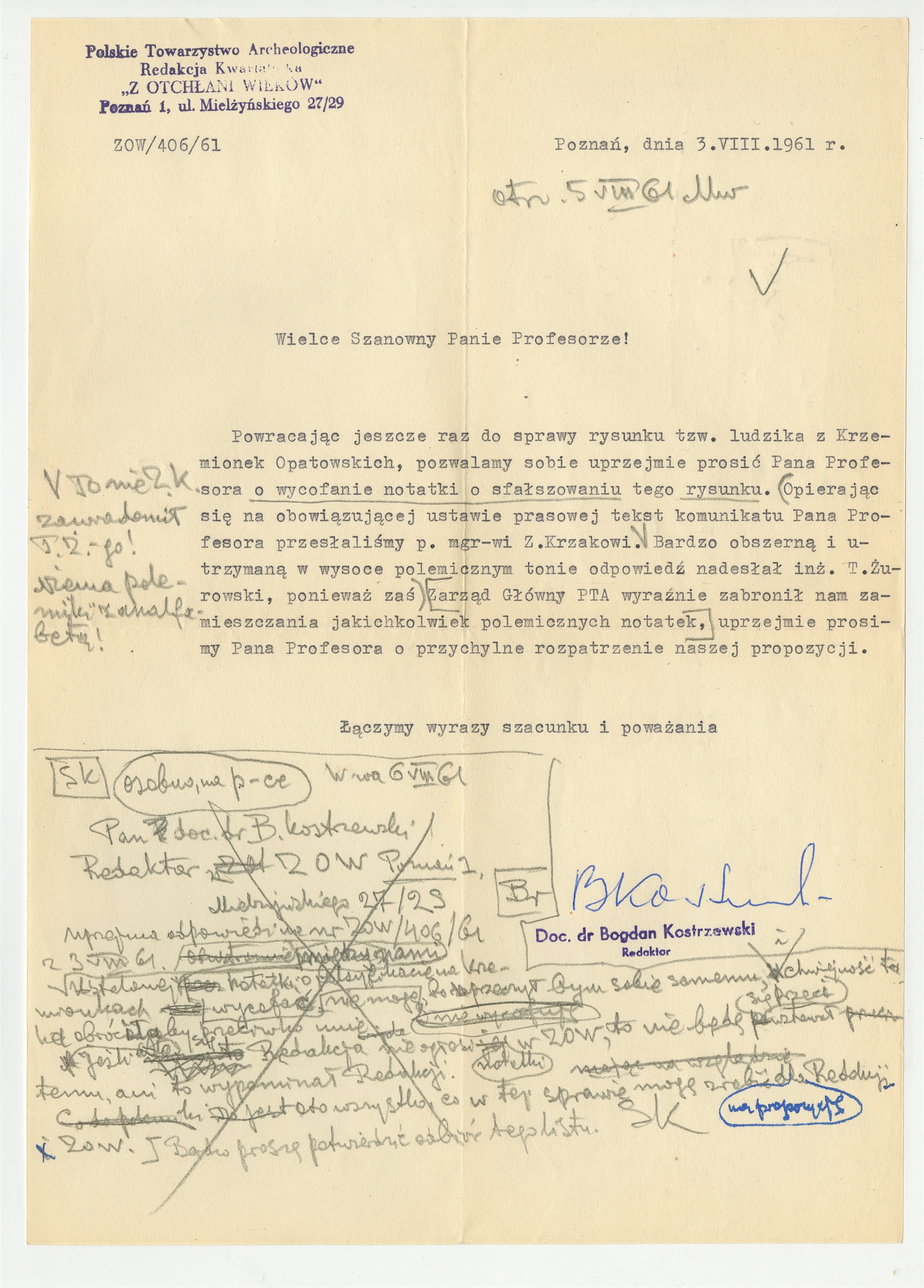 Maszynopis - list Bogdana Kostrzewskiego redaktora ZOW do Stefana Krukowskiego z dnia 3 VIII 1961 roku. Rękopis - brudnopis odpowiedzi Stefana Krukowskiego na list.