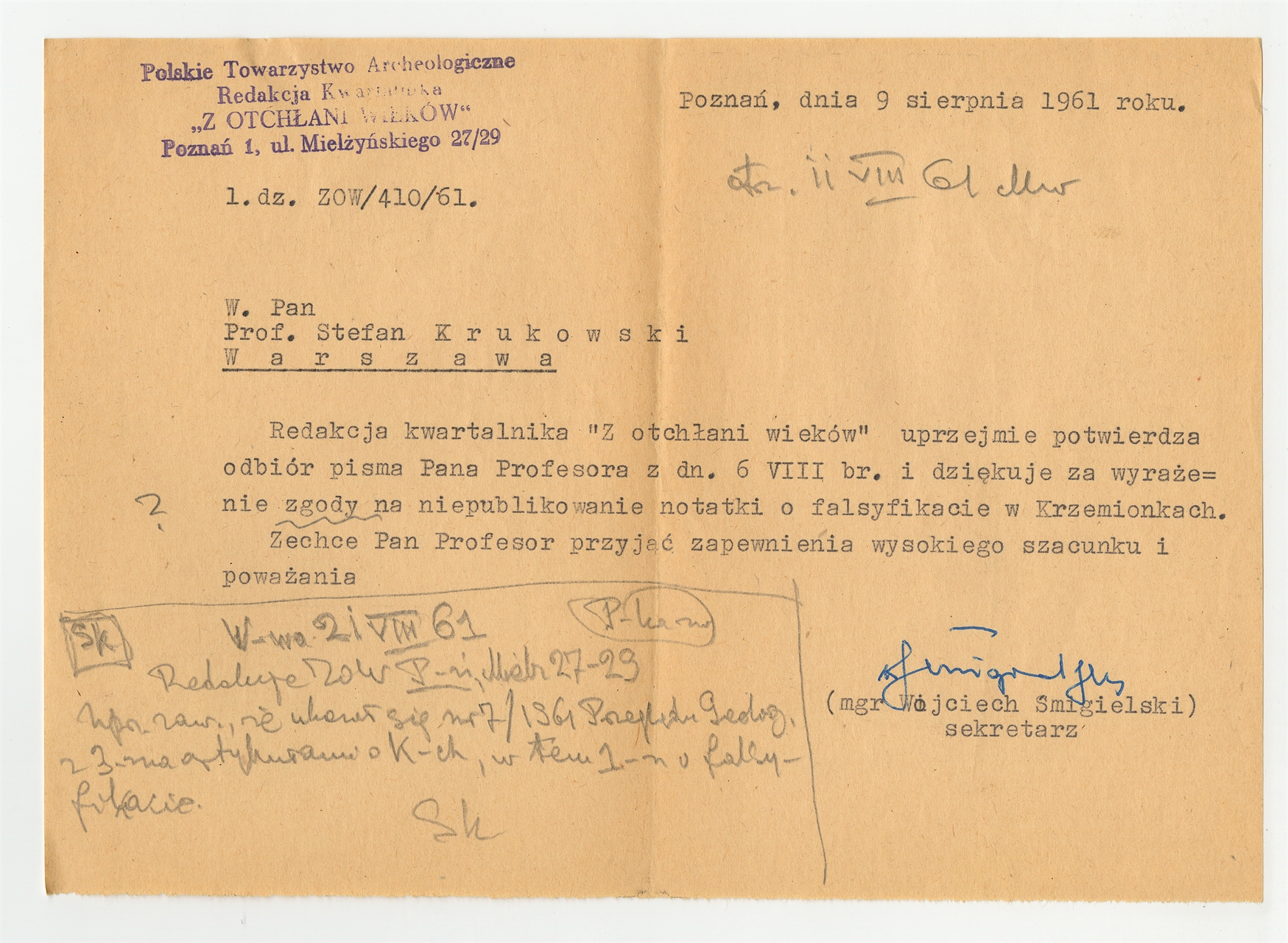 Maszynopis - list Bogdana Kostrzewskiego redaktora ZOW do Stefana Krukowskiego z dnia 9 sierpnia 1961 roku. Rękopis - brudnopis odpowiedzi Stefana Krukowskiego na list.