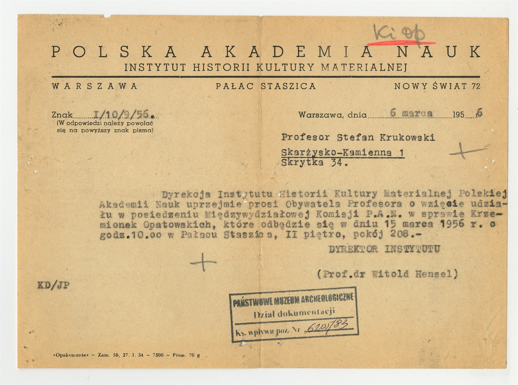 Maszynopis - list Dyrektora IHKM PAN do Stefana Krukowskiego z dnia 6 marca 1956 roku