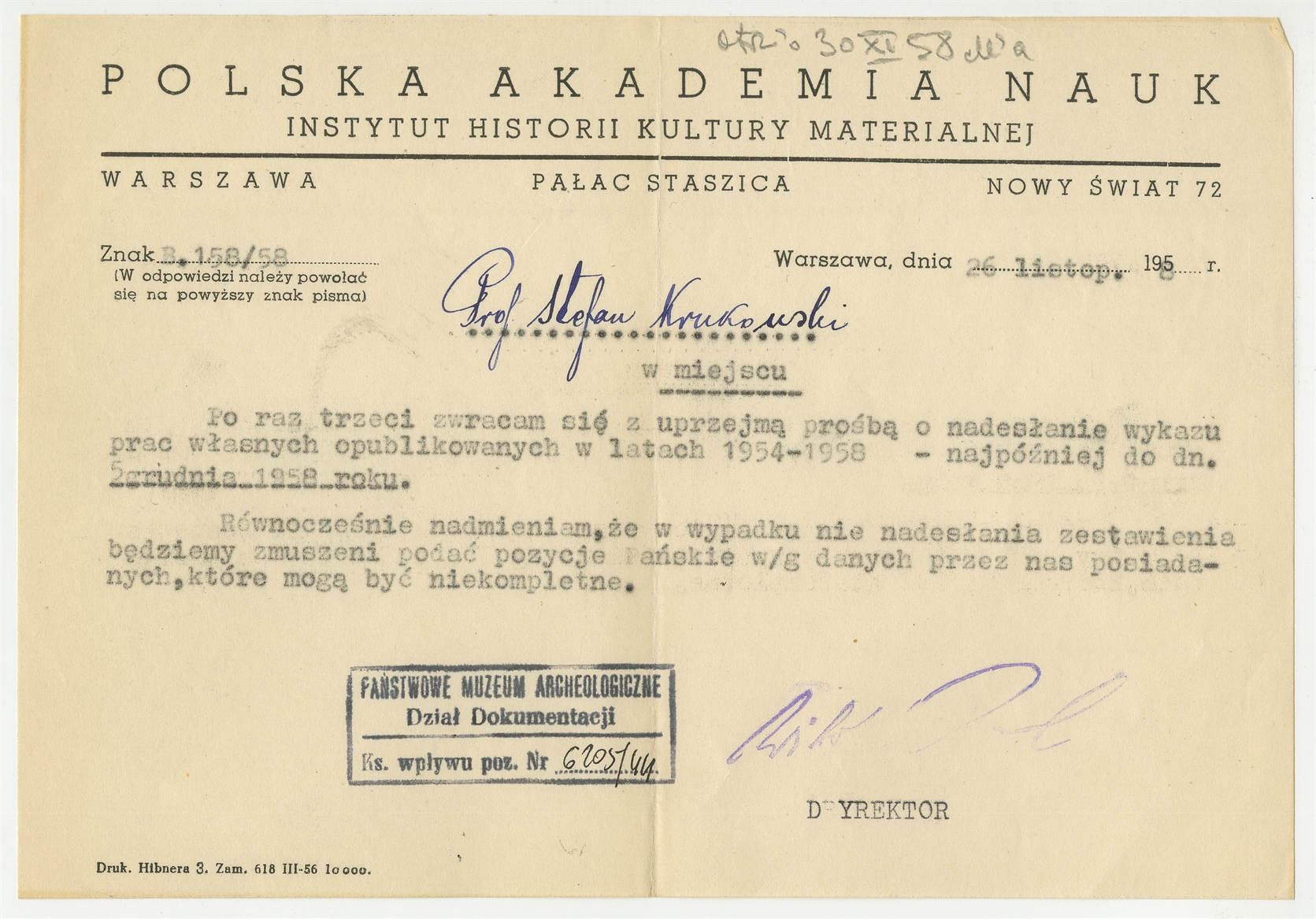 Maszynopis - list Dyrektora IIHKM PAN W. Hensla do S. Krukowskiego z dn. 26 XI 1958 r.