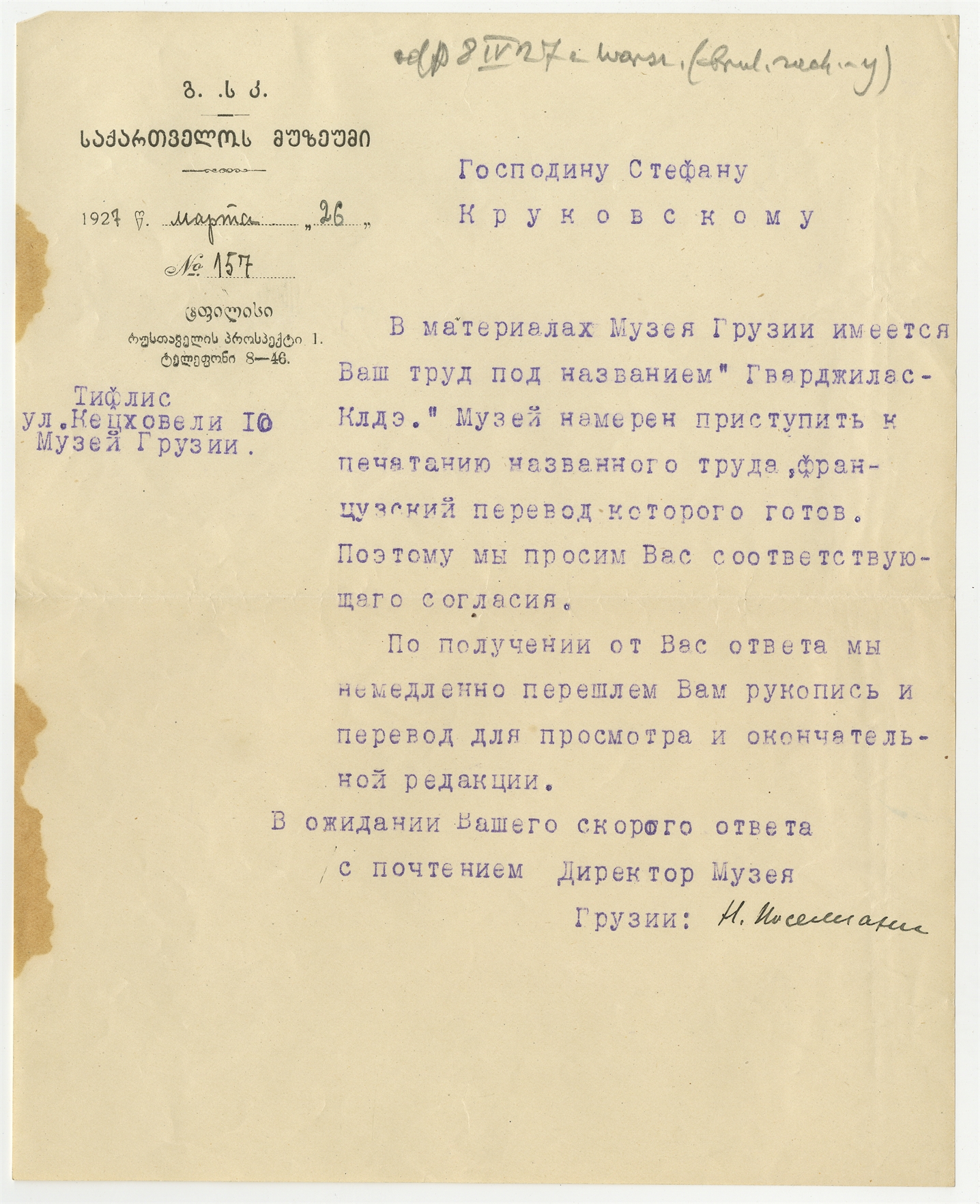 Maszynopis - list dyrektora Muzeum Gruzji do Stefana Krukowskiego z dnia 26 marca 1927 roku