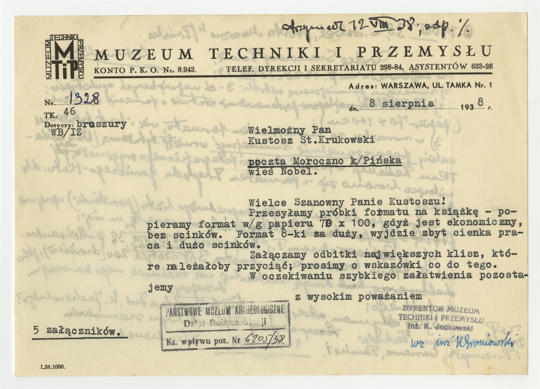 Maszynopis - list dyrektora Muzeum Techniki i Przemysłu do Stefana Krukowskiego z dnia 8 sierpnia 1938 roku