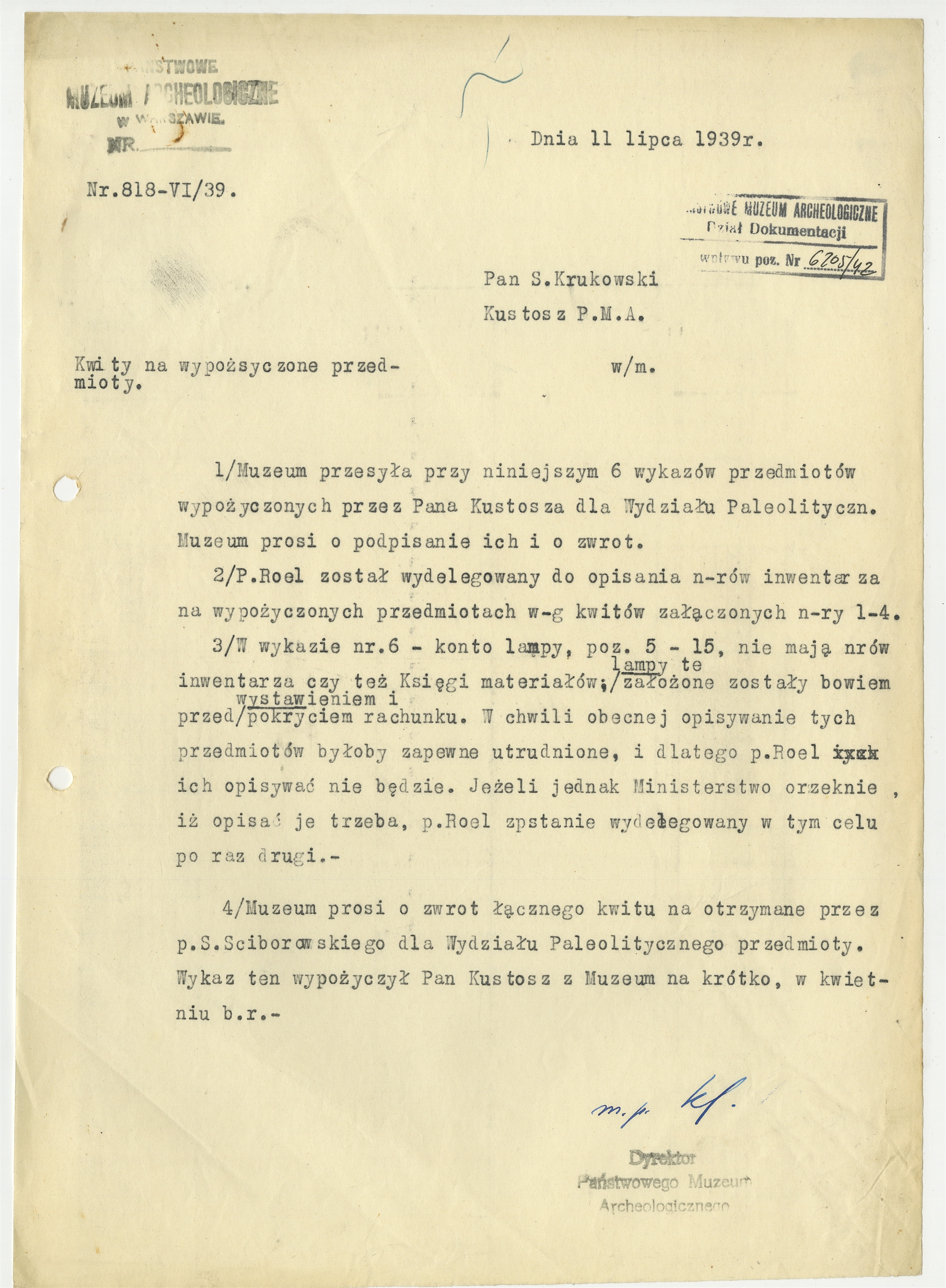 Maszynopis - list dyrektora PMA do Stefana Krukowskiego z dnia 11 lipca 1939 roku w sprawie kwitów