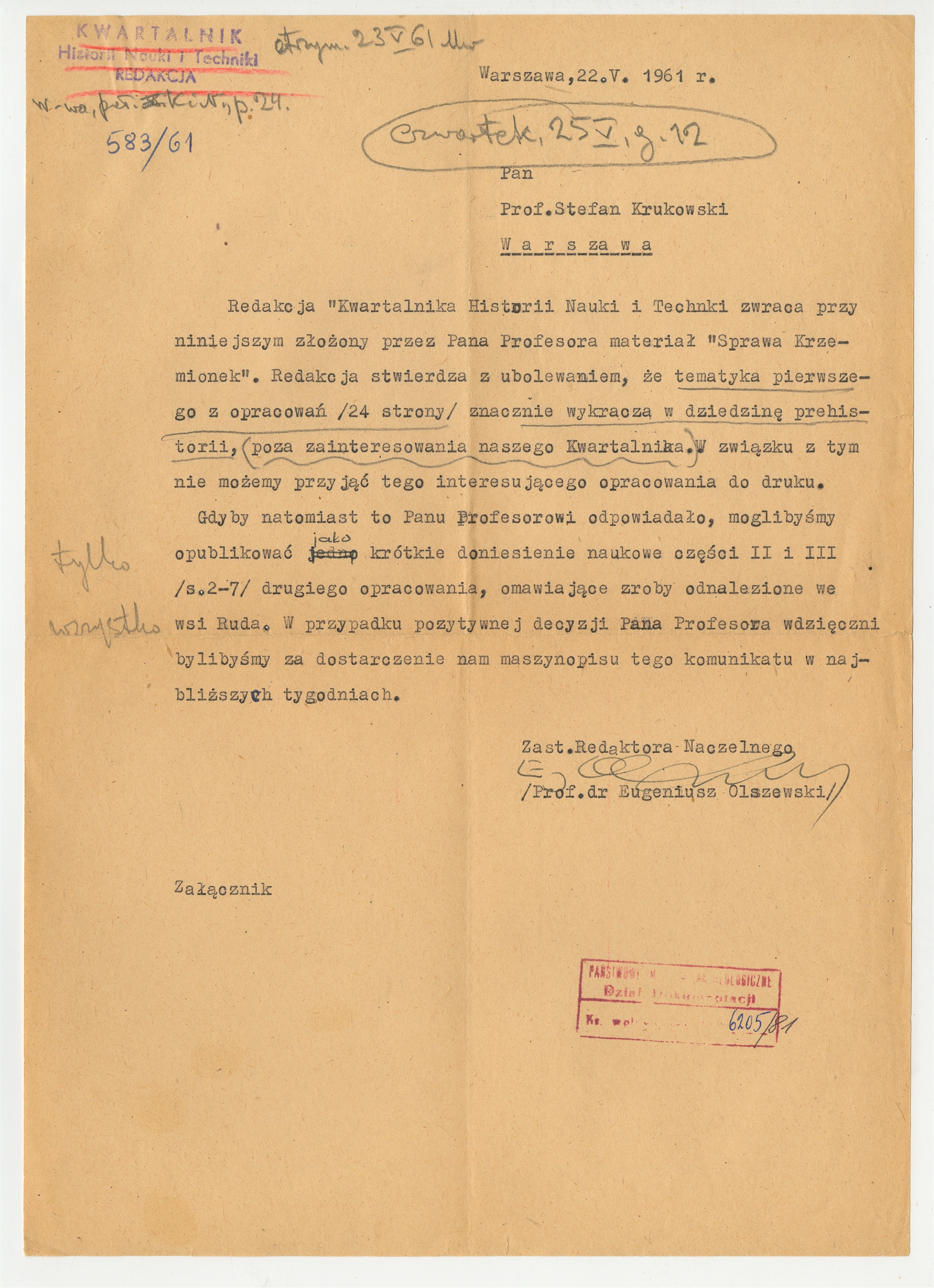 Maszynopis - list Eugeniusza Olszewskiego do Stefana Krukowskiego z dnia 22 V 1961 roku