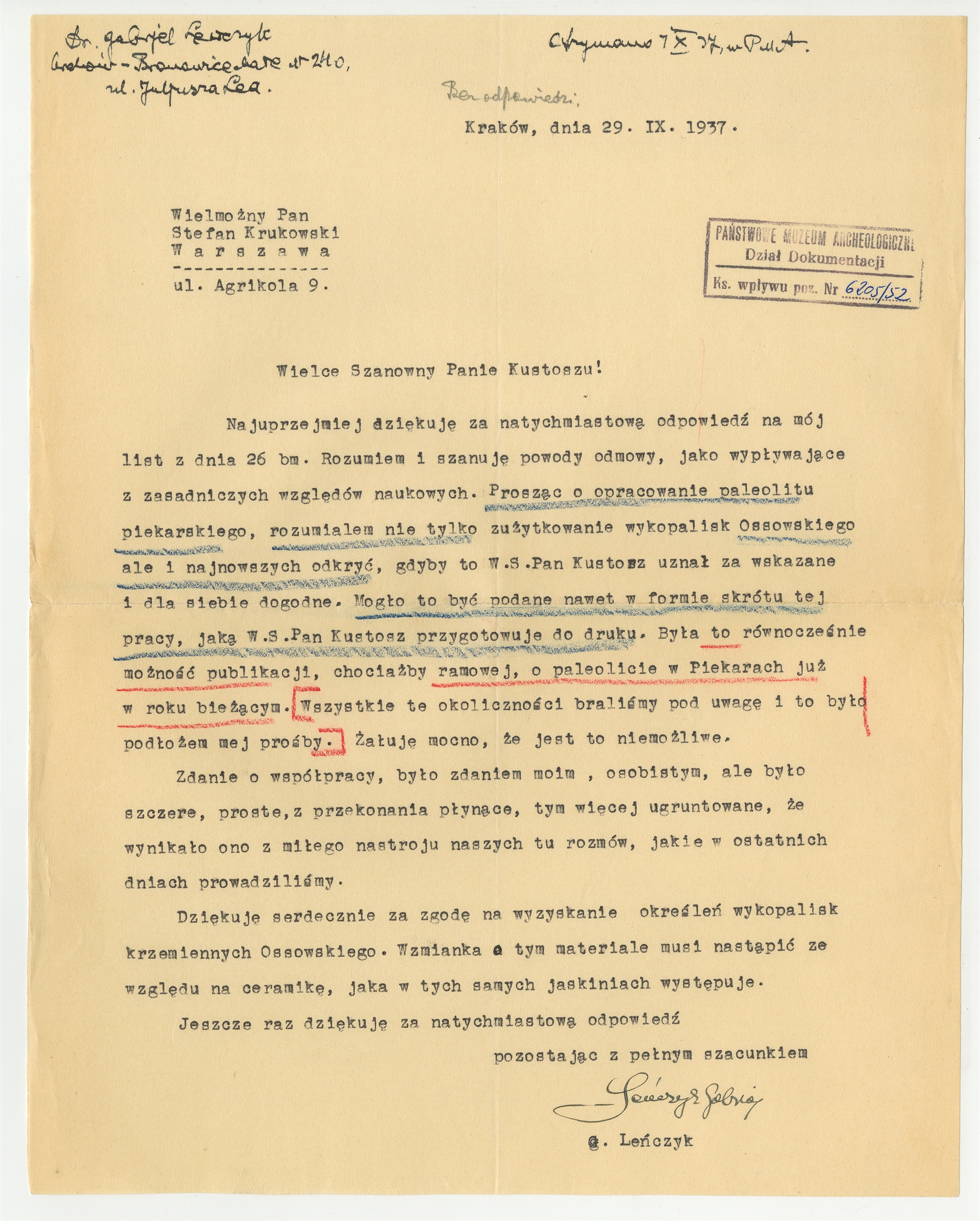 Maszynopis - list Gabrjela Leńczyka do Stefana Krukowskiego z dnia 29 IX 1937 roku