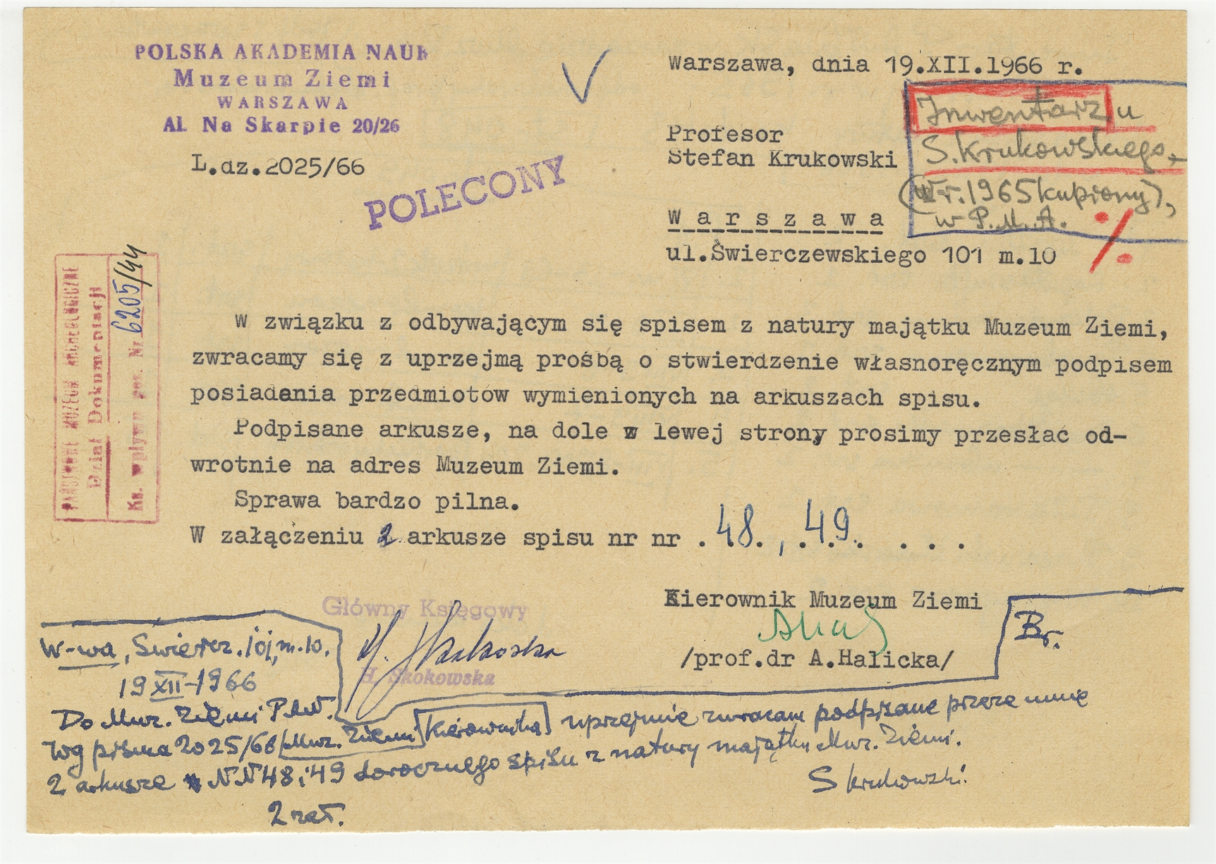 Maszynopis - list A. Halickiej Kierownik Muzeum Ziemi do S. Krukowskiego z dn. 19 XII 1966 r.Rękopis - brudnopis listu S. Krukowskiego do Muzeum Ziemi PAN z dn. 19 XII 1966 r.