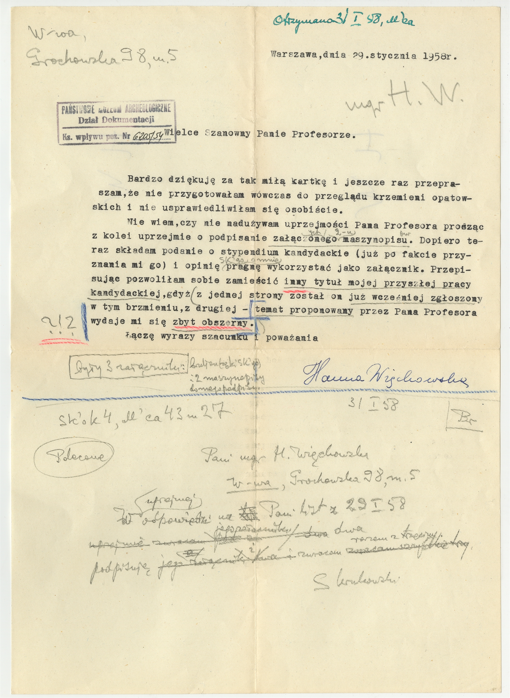 Maszynopis - list Hanny Więckowskiej do Stefana Krukowskiego z dnia 29 stycznia 1958 roku. Rękopis - brudnopis odpowiedzi Stefana Krukowskiego z dnia 31 I [19]58 roku na list