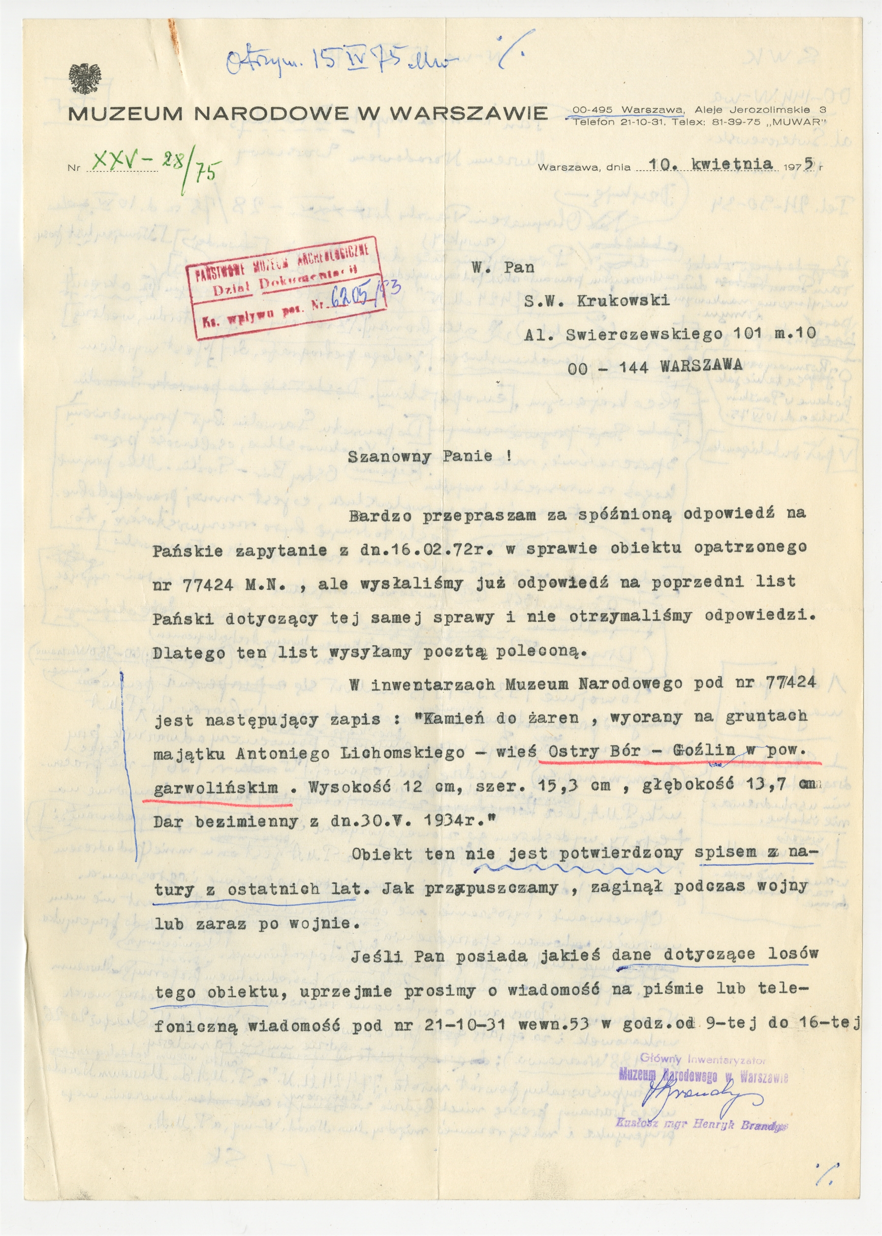 Maszynopis - list Henryka Brandysa kustosza Muzeum Narodowego do Stefana Krukowskiego z dnia 10 kwietnia 1975 roku