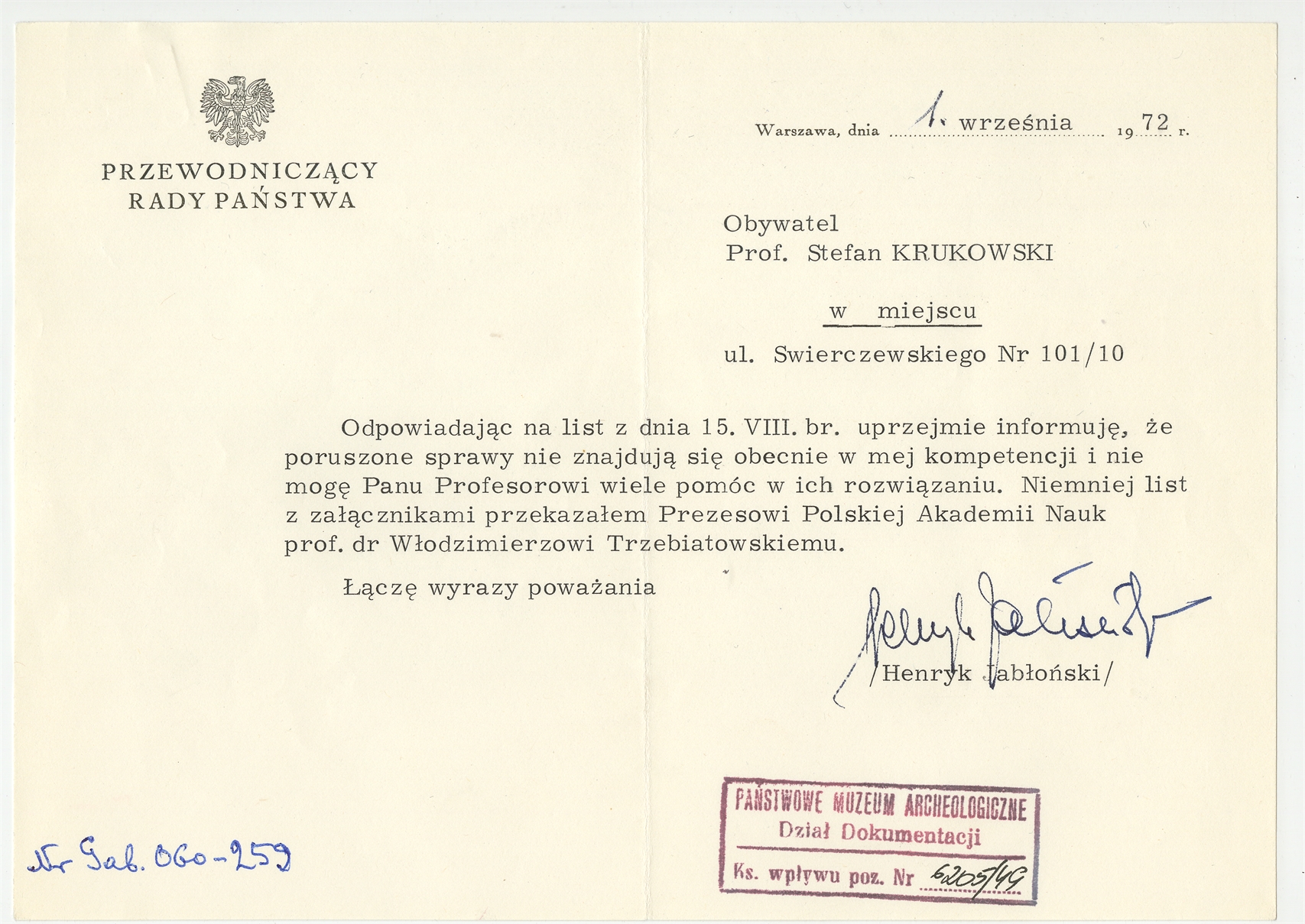 Maszynopis - list Henryka Jabłońskiego Przewodniczącego Rady Państwa do Stefana Krukowskiego z dn. 1 IX 1972 r. wraz z kopertą
