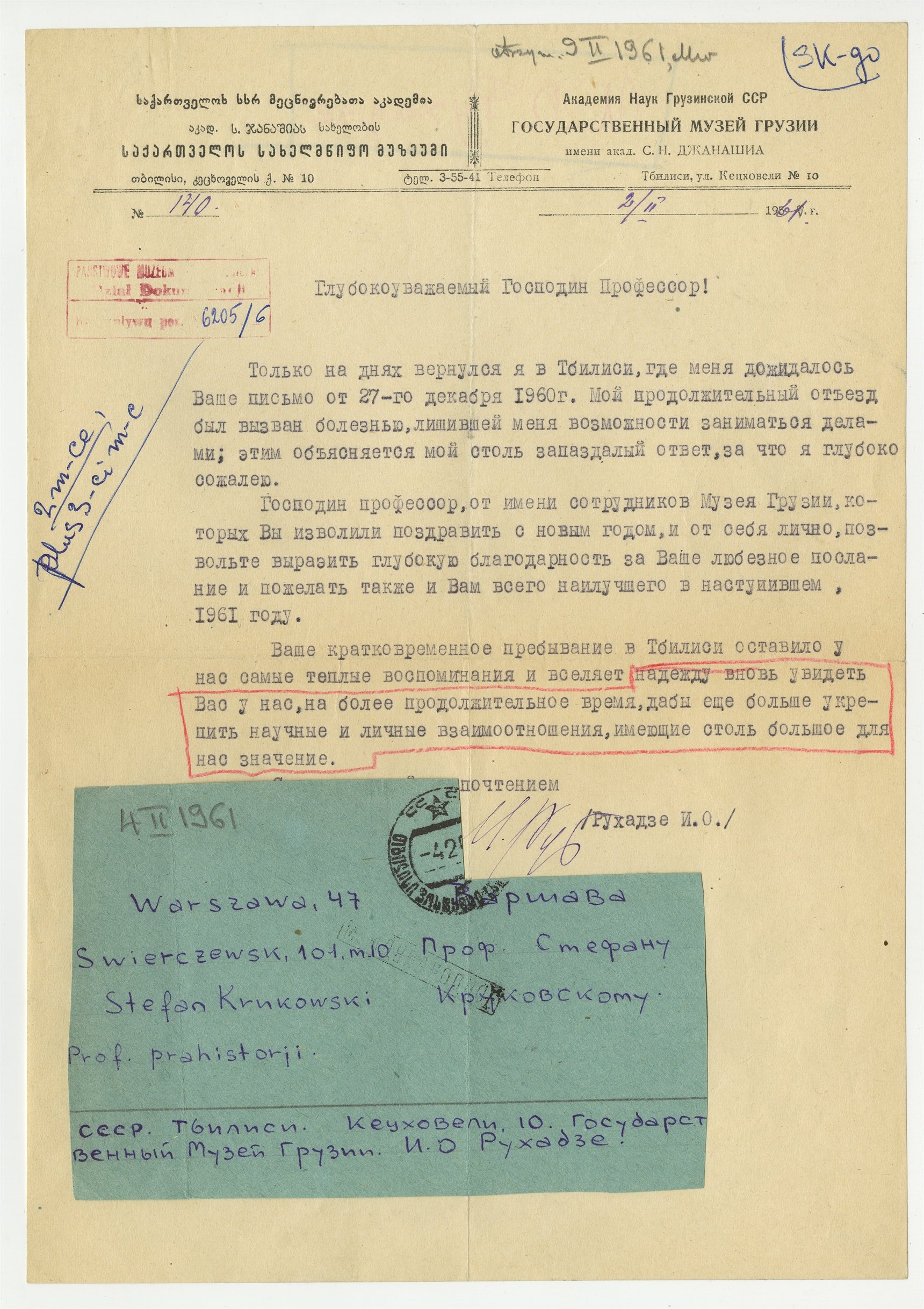 Maszynopis - list I.O. Ruhadze dyrektora Państwowego Muzeum Gruzji do Stefana Krukowskiego z dnia 2 II 1961 roku