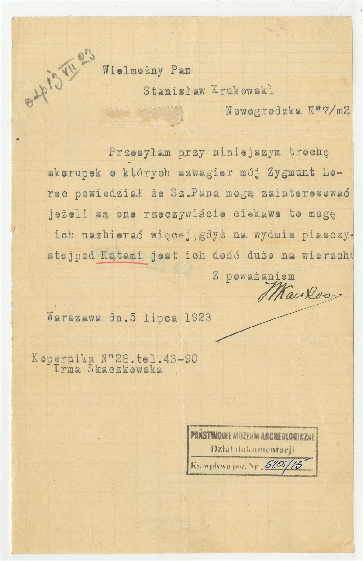 Maszynopis - list Irmy Skaczkowskiej do Stefana Krukowskiego z dnia 5 lipca 1923 roku