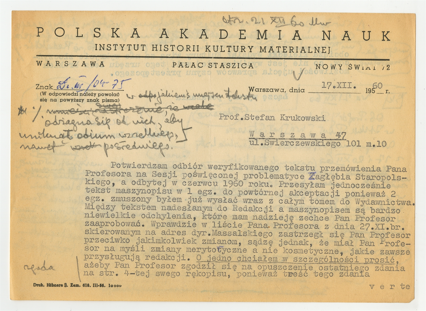 Maszynopis - list Jana Pazdura do Stefana Krukowskiego z dnia 17 XII 1960 roku.