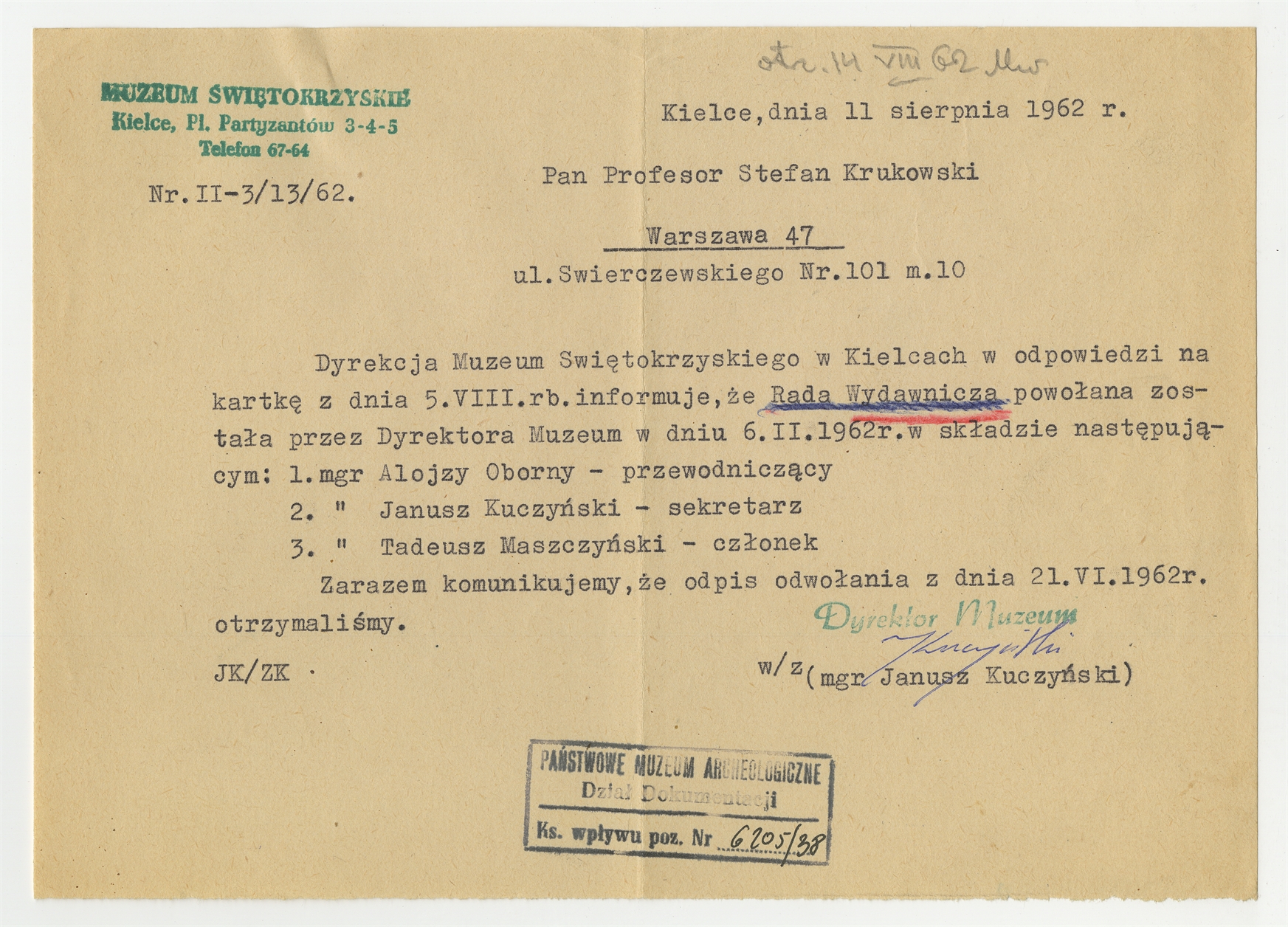 Maszynopis - list Janusza Kuczyńskiego  w/z dyrektora Muzeum Świętokrzyskiego do Stefana Krukowskiego z dnia 11 sierpnia 1962 roku