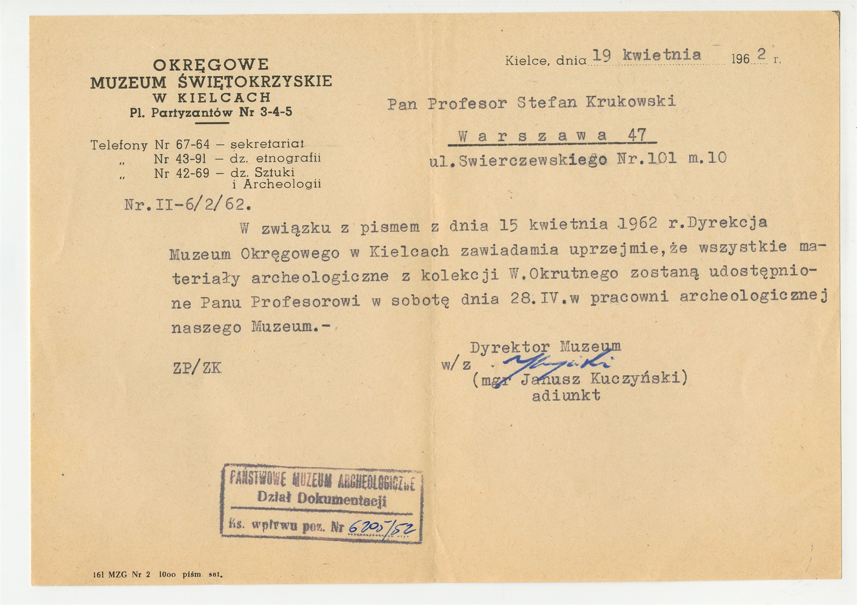 Maszynopis - list Janusza Kuczyńskiego w/z dyrektora Muzeum Świętokrzyskiego do Stefana Krukowskiego z dnia 19 kwietnia 1962 roku