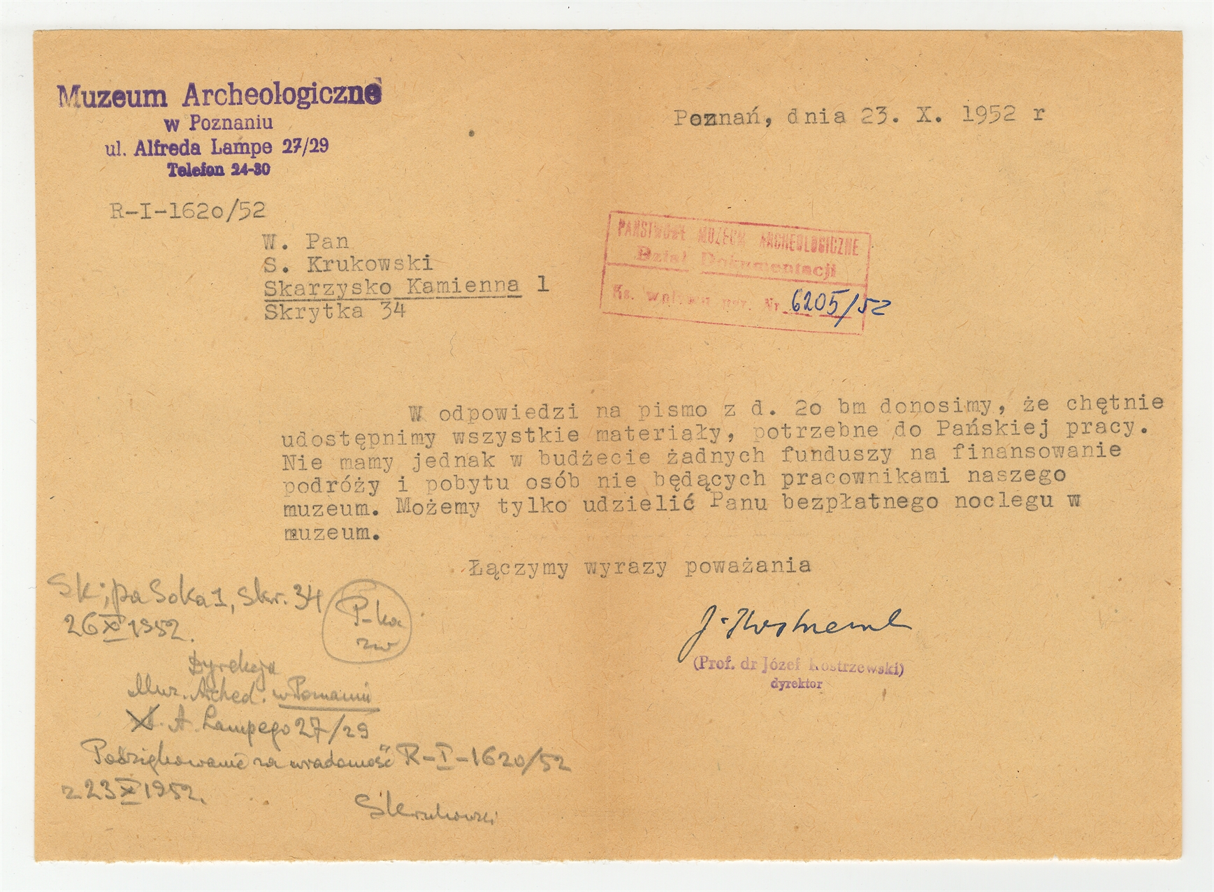 Maszynopis - list Józefa Kostrzewskiego do Stefana Krukowskiego z dnia 23 X 1952 roku. Notatka ręką S. Krukowskiego dotycząca treści listu