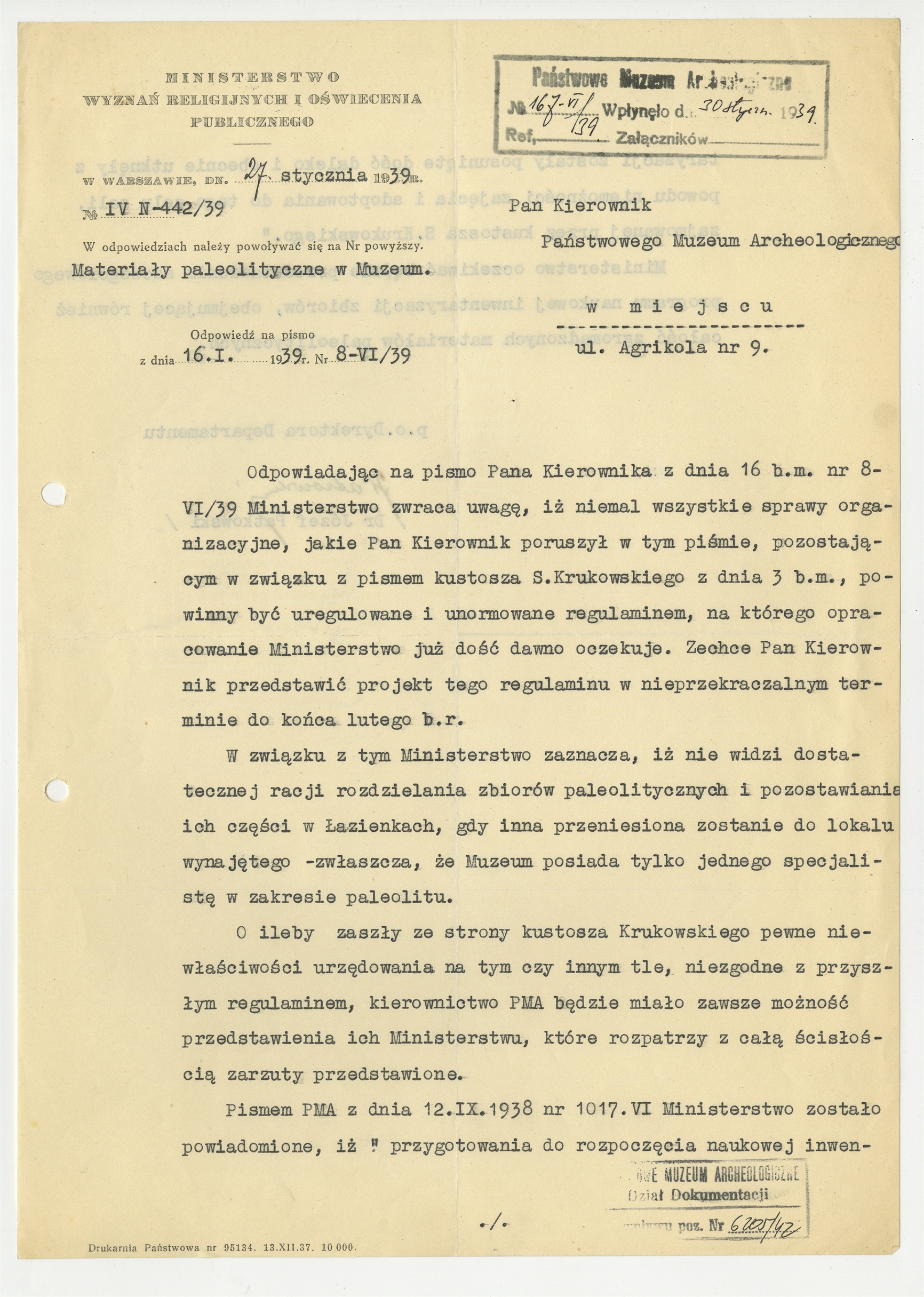 Maszynopis - list Józefa Patkowskiego do Kierownika Państwowego Muzeum Archeologicznego w Warszawie z dnia 27 stycznia 1939 roku