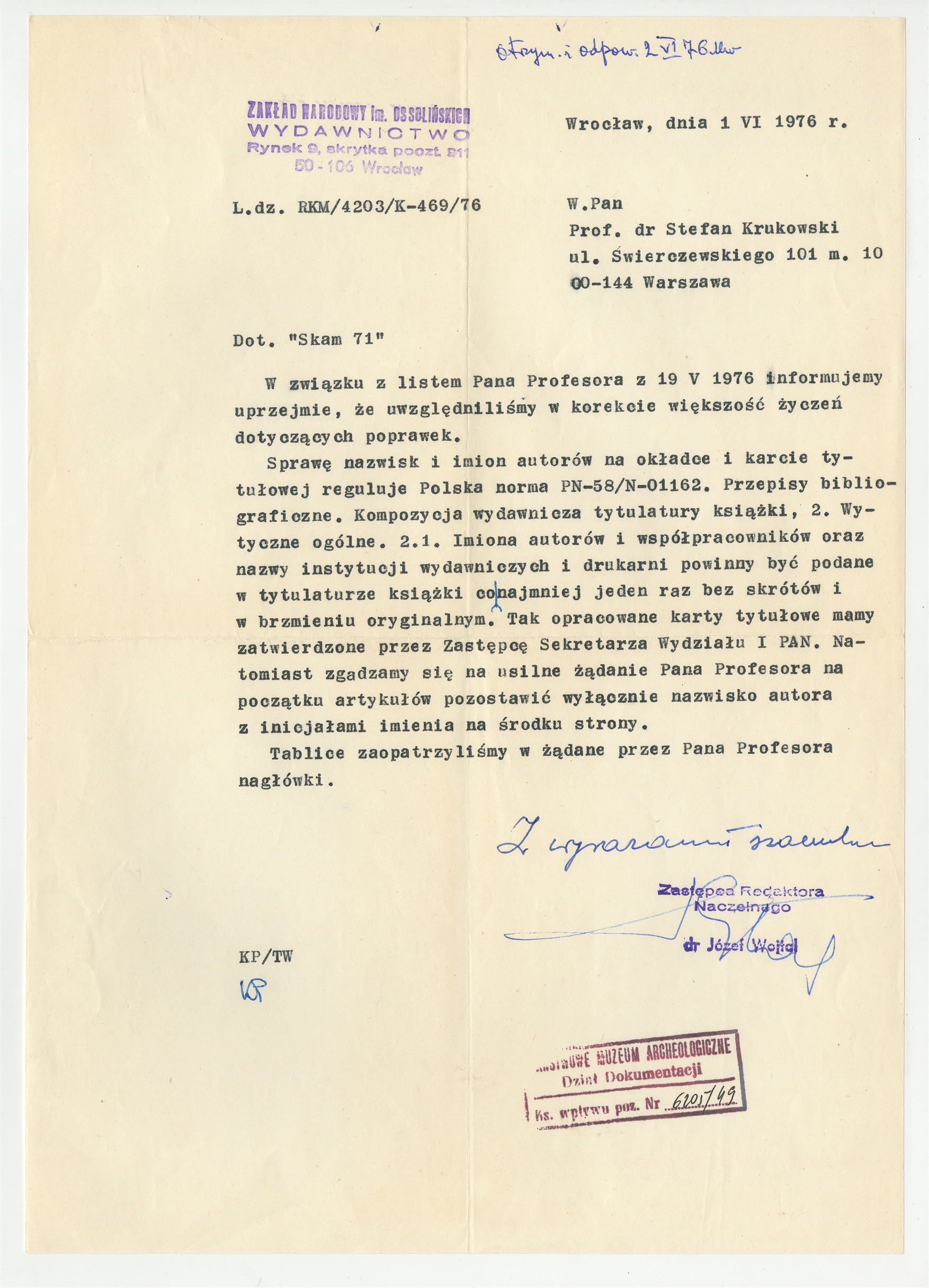 Maszynopis - list Józefa Wojtala Zastępcy Redaktora Naczelnego Wydawnictwa Ossolineum do Stefana Krukowskiego z dn. 1 VI 1976 r.