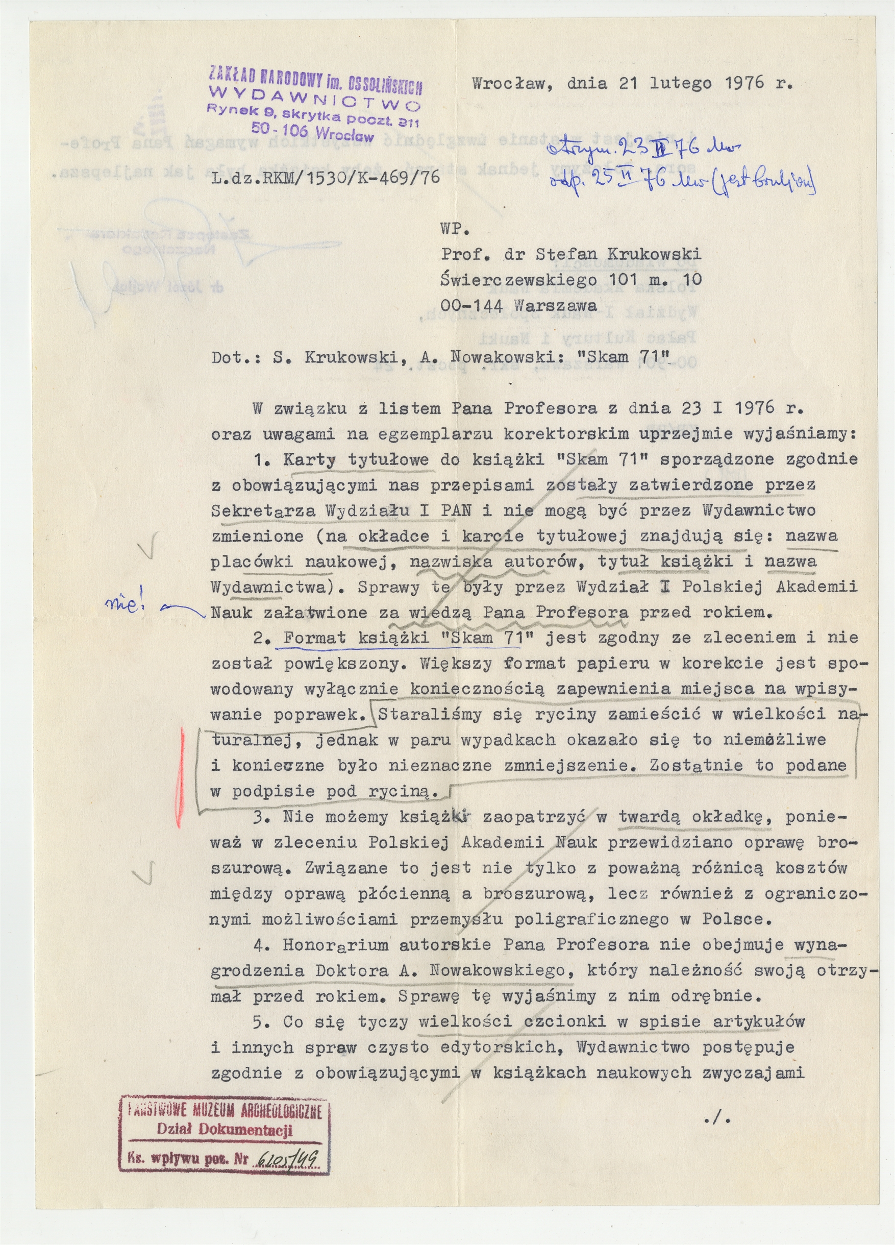 Maszynopis - list Józefa Wojtala Zastępcy Redaktora Naczelnego Wydawnictwa Ossolineum do Stefana Krukowskiego z dn. 21 II 1976 r.