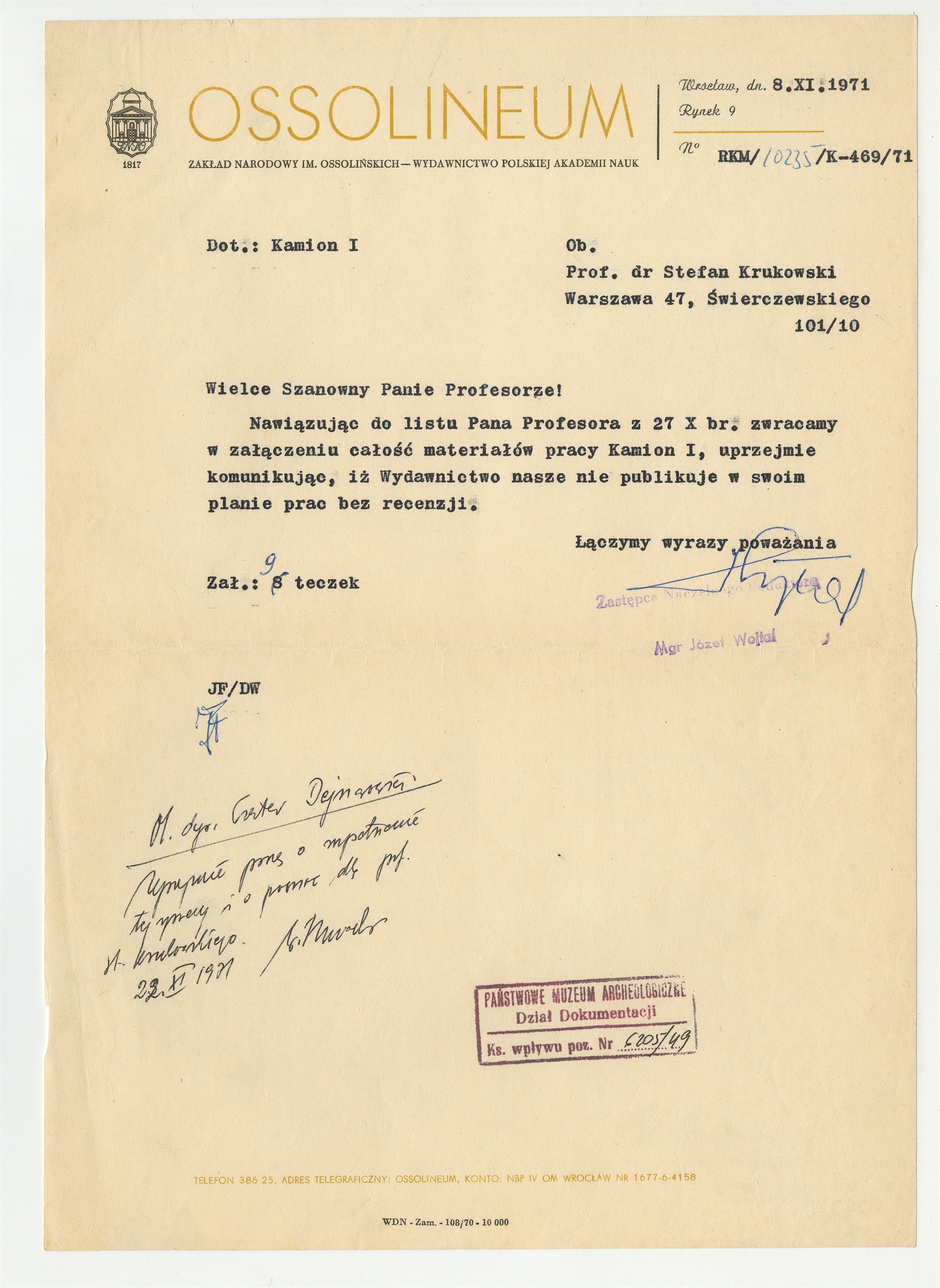 Maszynopis - list Józefa Wojtala Zastępcy Redaktora Naczelnego Wydawnictwa Ossolineum do Stefana Krukowskiego z dn. 8 XI 1976 r.