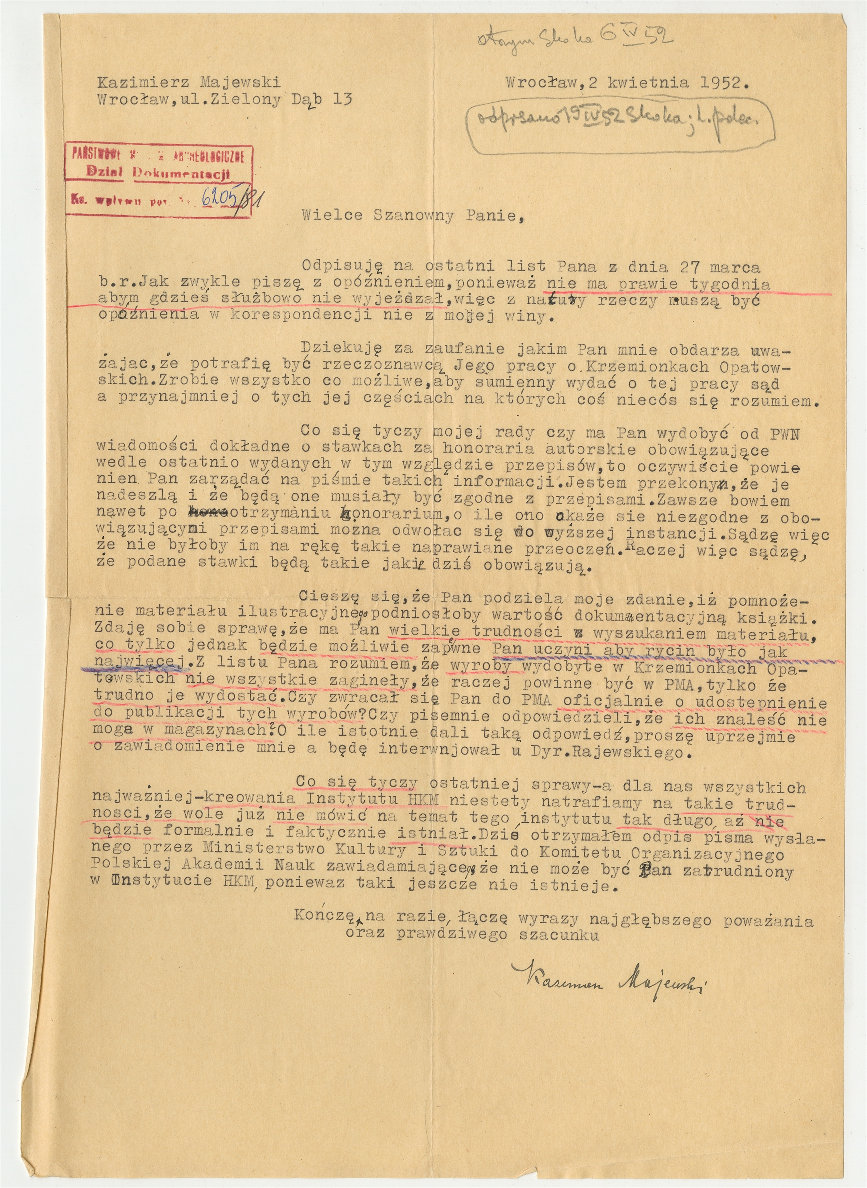Maszynopis - list Kazimierza Majewskiego do Stefana Krukowskiego z dnia 2 kwietnia 1952 roku