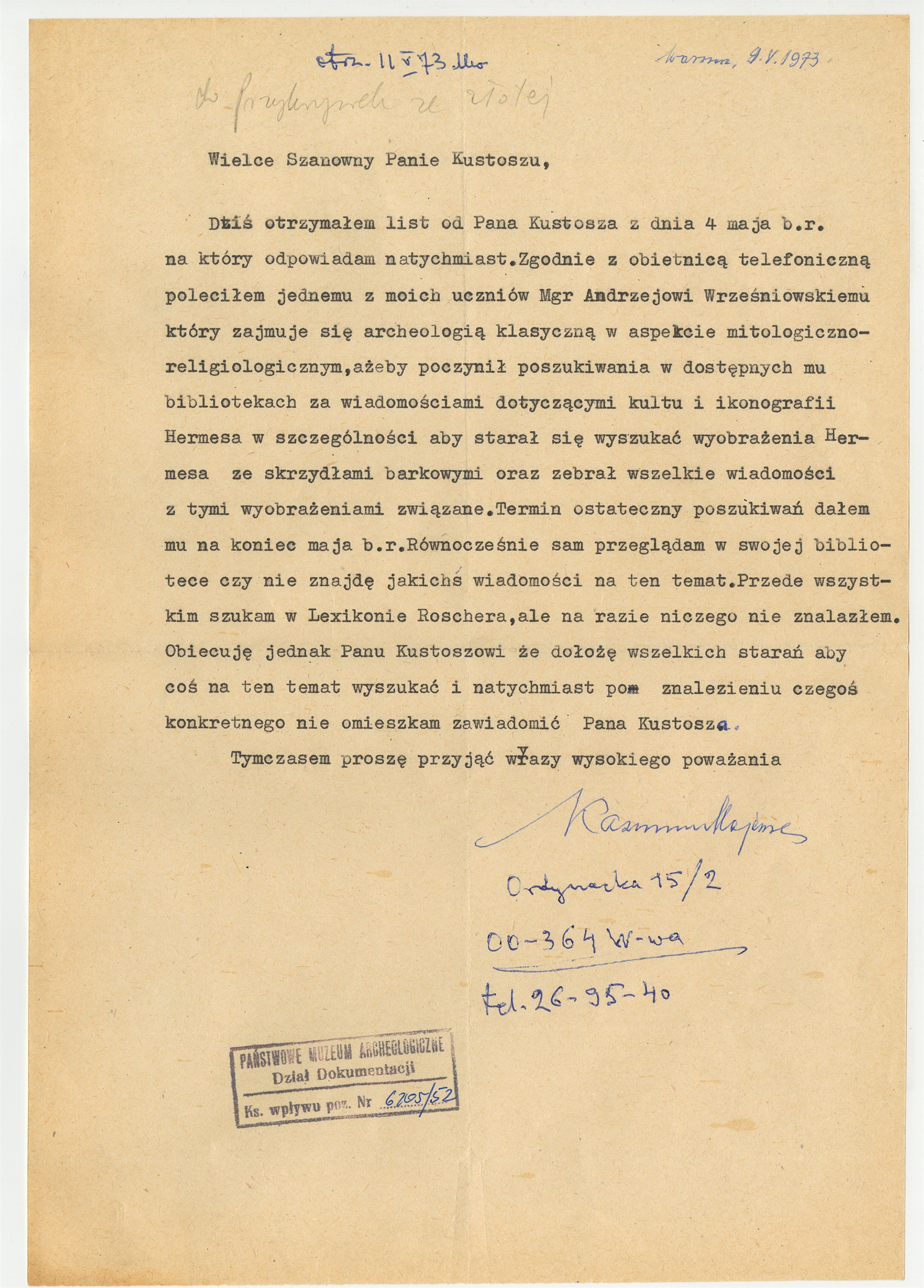 Maszynopis - list Kazimierza Majewskiego do Stefana Krukowskiego z dnia 9 V 1973 roku
