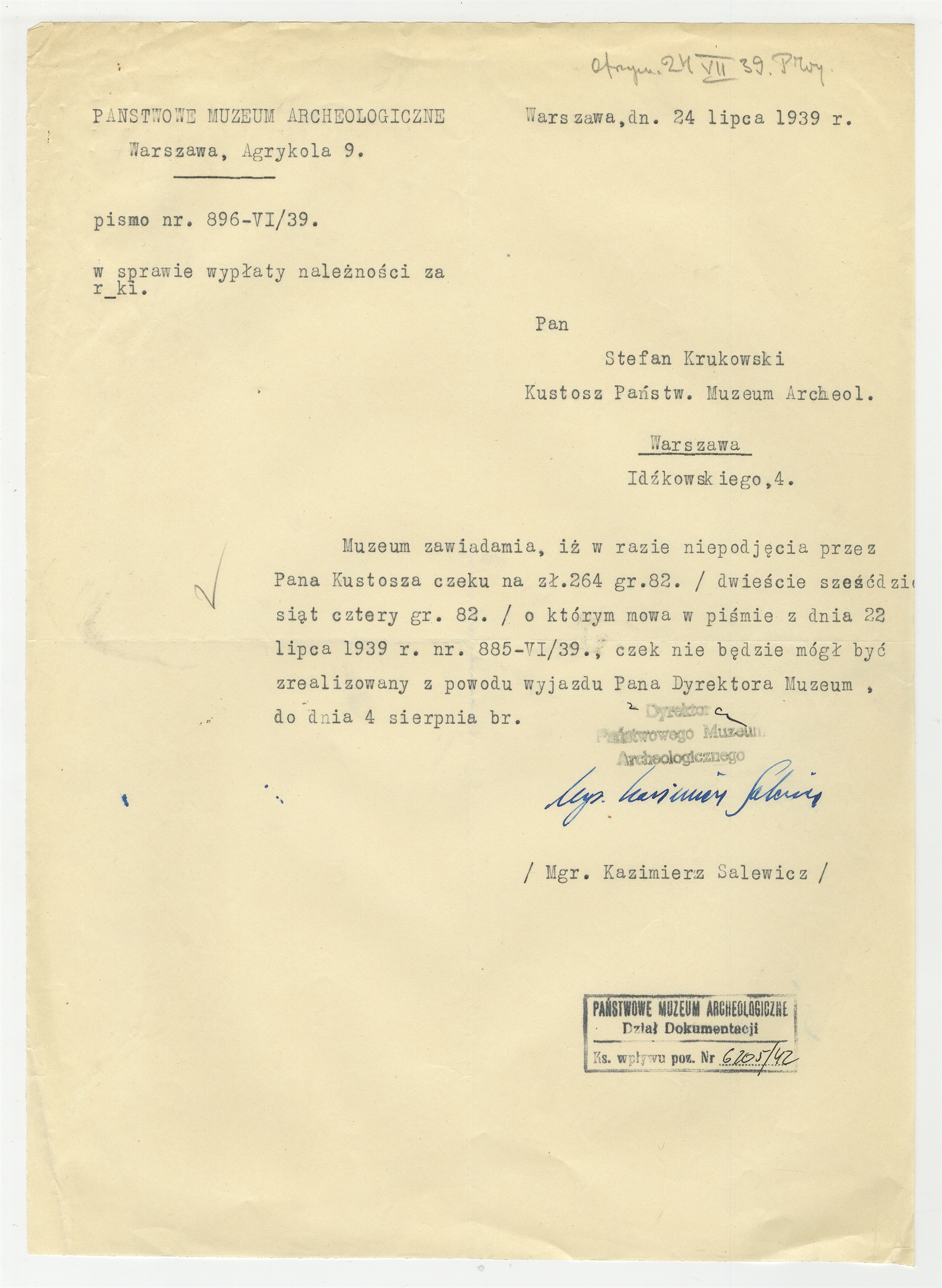 Maszynopis - list Kazimierza Salewicza do Stefana Krukowskiego z dnia 24 lipca 1939 roku w sprawie wypłaty należności