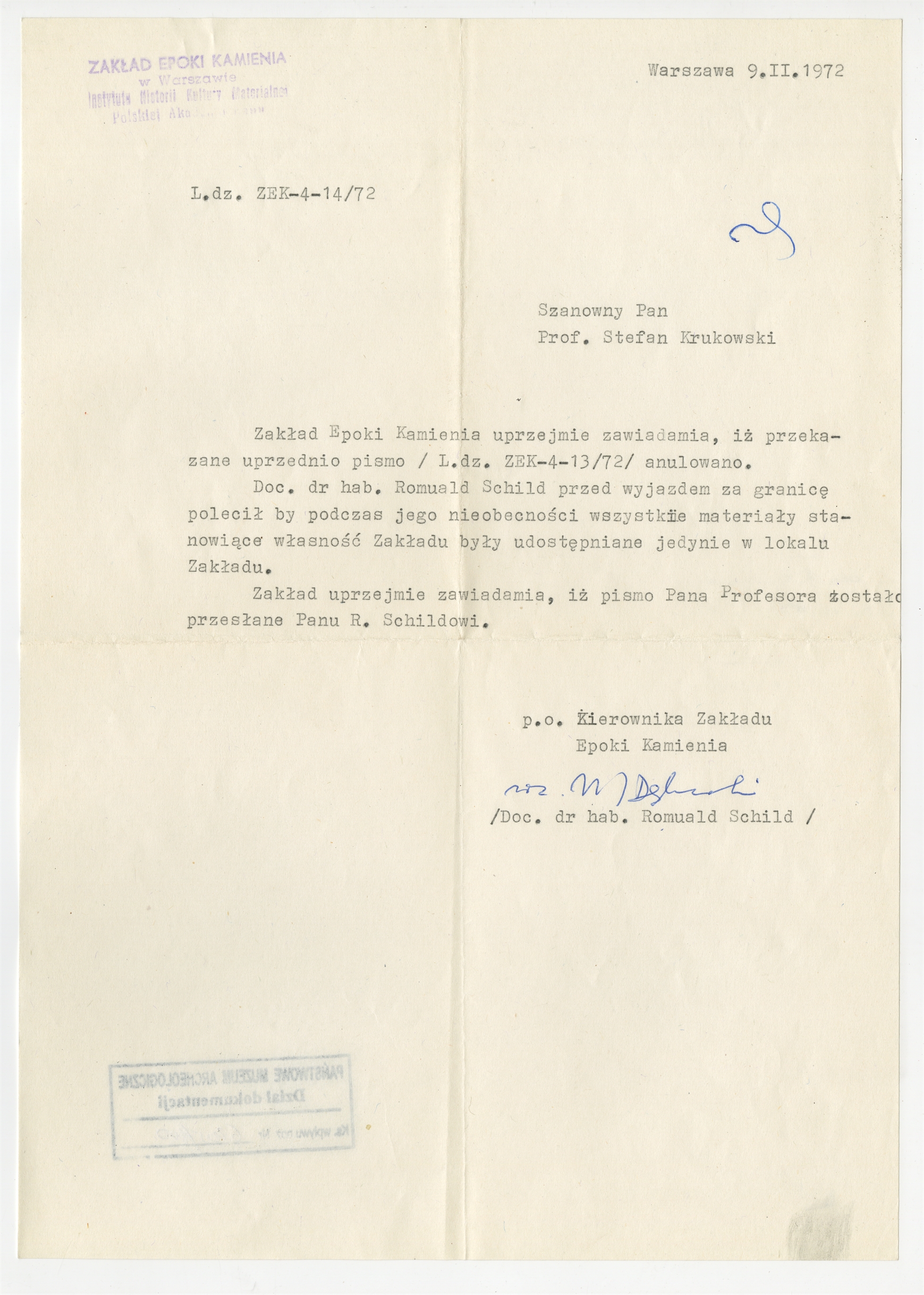 Maszynopis - list Kierownika Zakładu Epoki Kamienia IHKM PAN do Stefana Krukowskiego z dnia 9 II 1972 roku