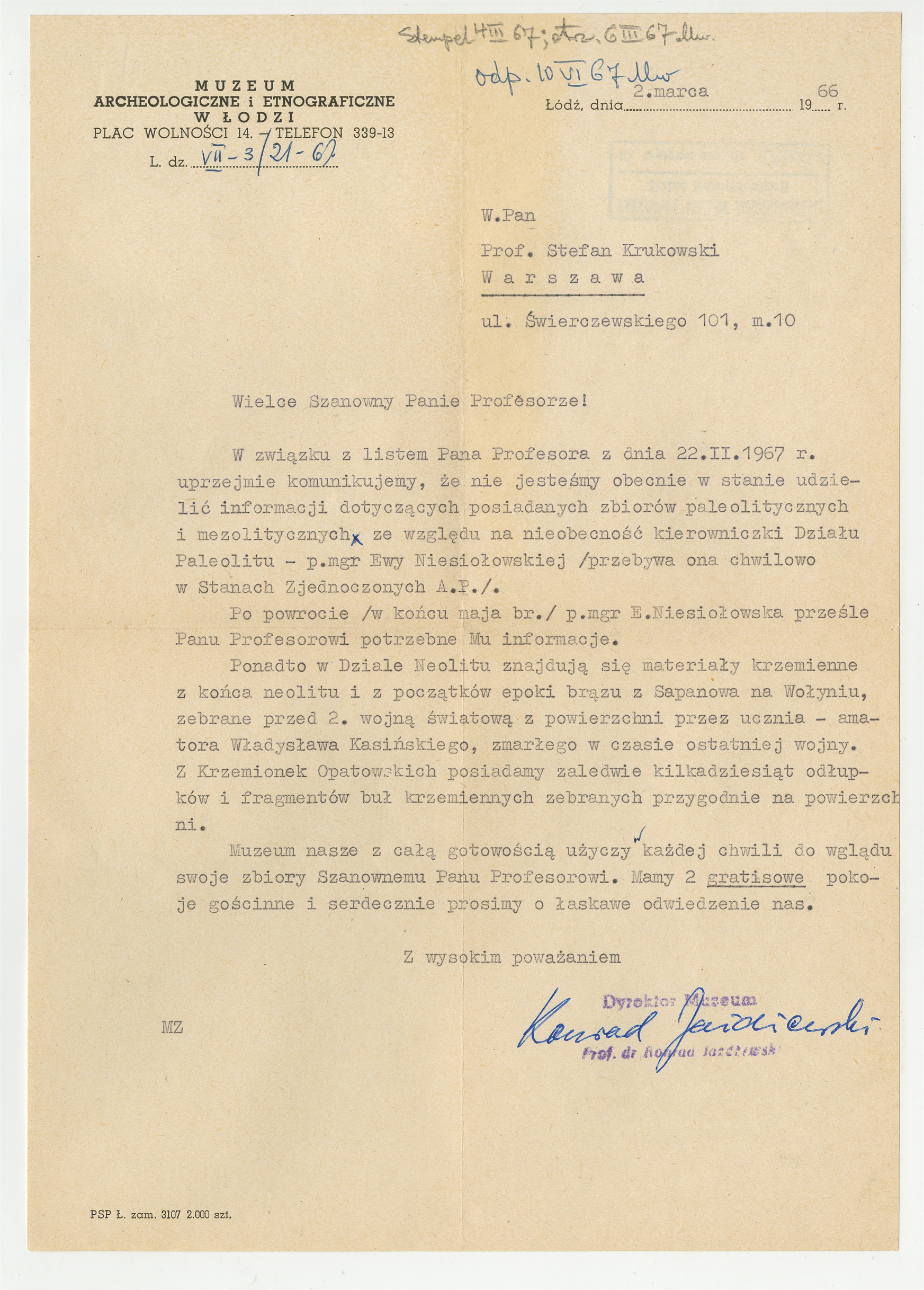 Maszynopis - list Konrada Jażdżewskiego dyrektora Muzeum Archeologicznego i Etnograficznego w Łodzi do Stefana Krukowskiego z dnia 2 marca 1967 roku