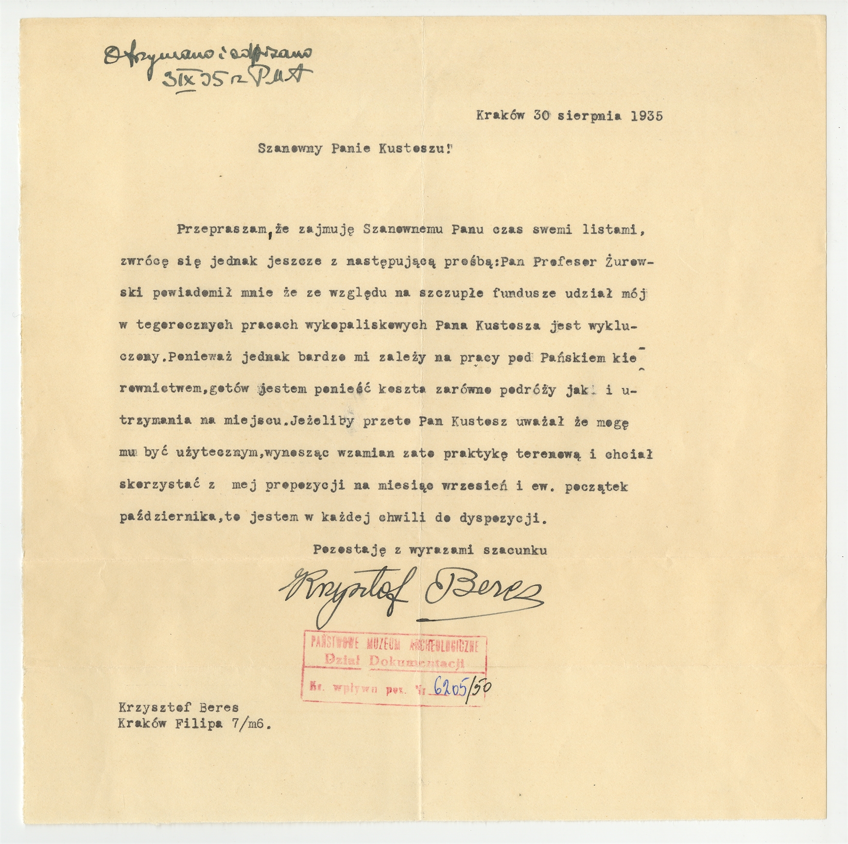 Maszynopis - list Krzysztofa Beresa do Stefana Krukowskiego z dn. 30 VIII 1935 r.
