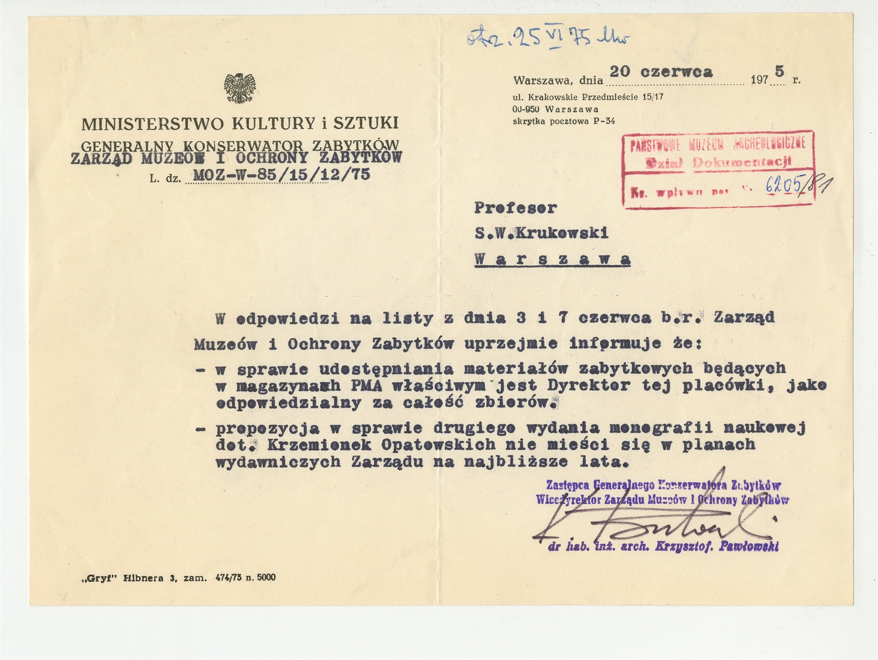 Maszynopis - list Krzysztofa Pawłowskiego do Stefana Krukowskiego z dnia 20 czerwca 1975 roku