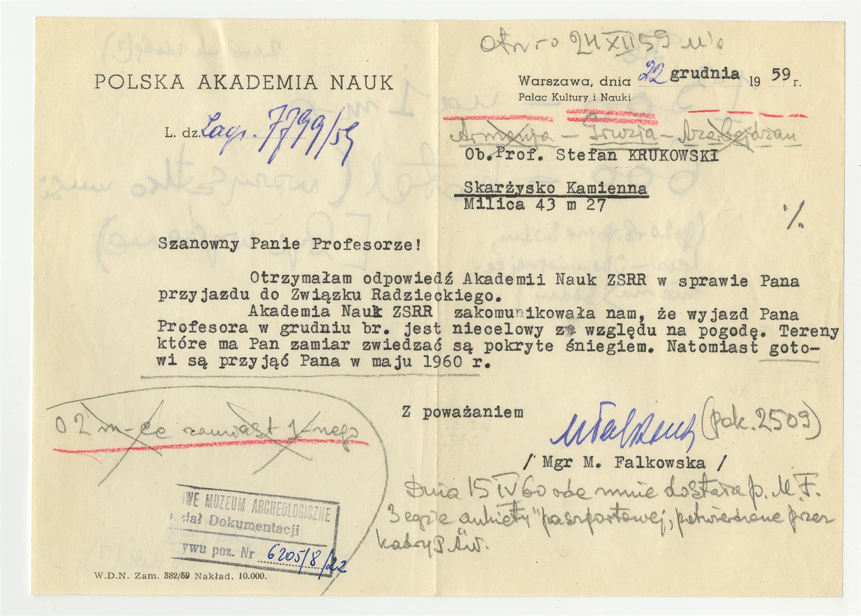 Maszynopis - list M. Falkowskiej do Stefana Krukowskiego z dnia 22 grudnia 1959 roku w sprawie wyjazdu do Gruzji