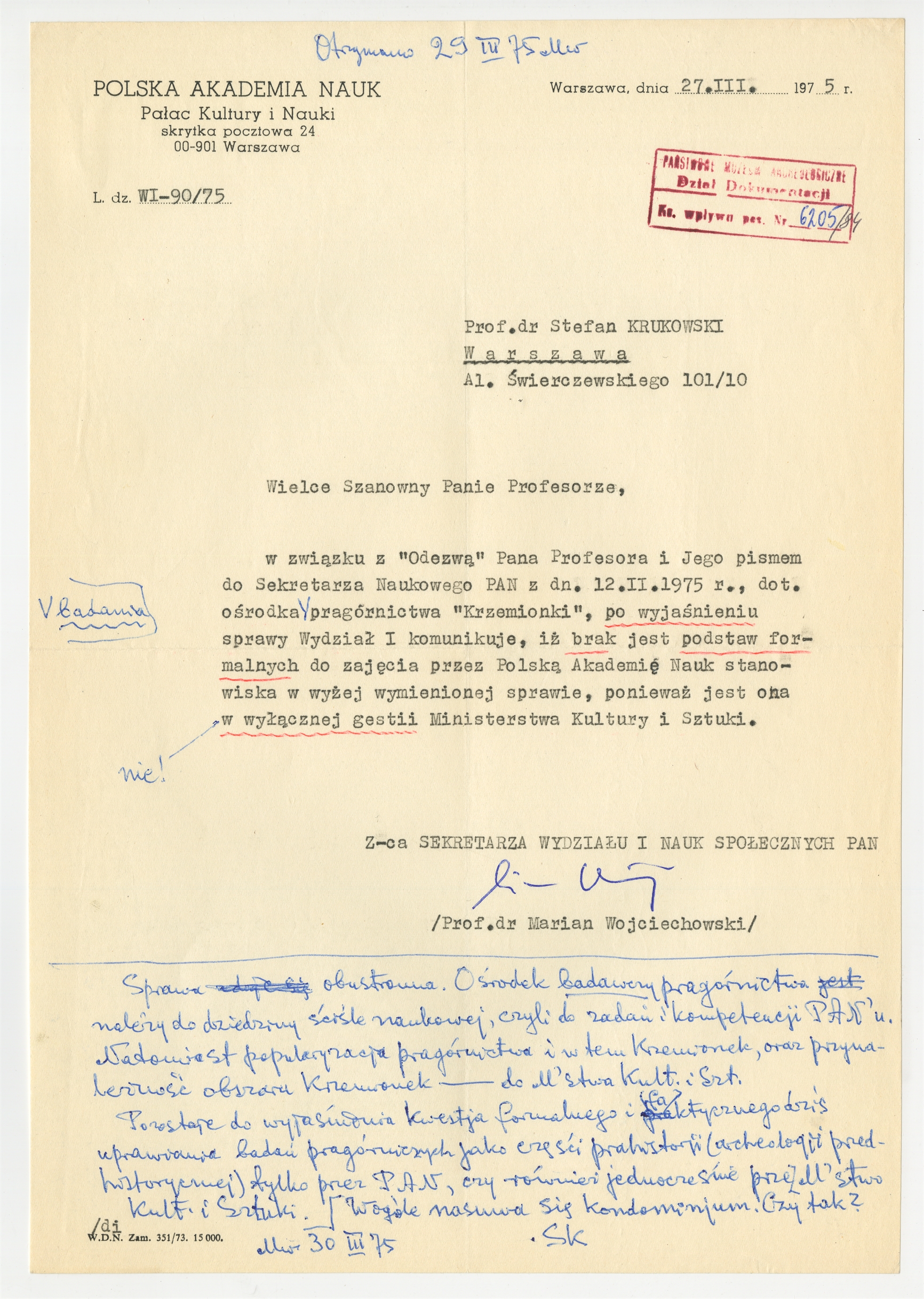 Maszynopis - list Mariana Wojciechowskiego sekretarza Wydziału I Nauk Społecznych PAN do Stefana Krukowskiego z dnia 27 III 1975 roku