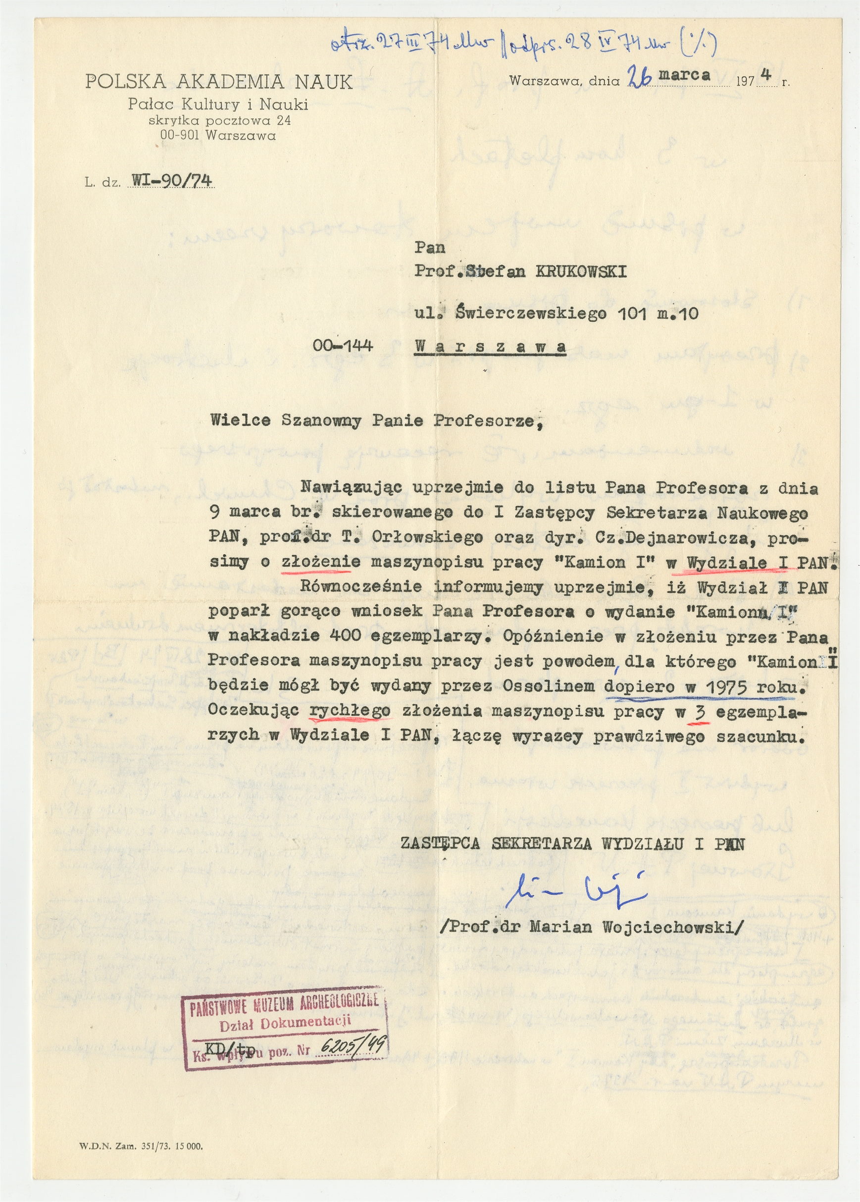 Maszynopis - list Mariana Wojciechowskiego z PAN do Stefana Krukowskiego z dn. 26 III 1974 r.