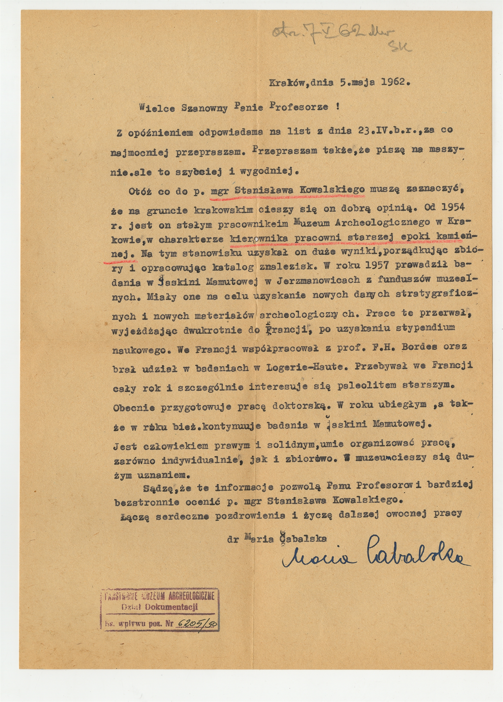 Maszynopis - list Marii Cabalskiej do Stefana Krukowskiego z dn. 5 V 1962 r.