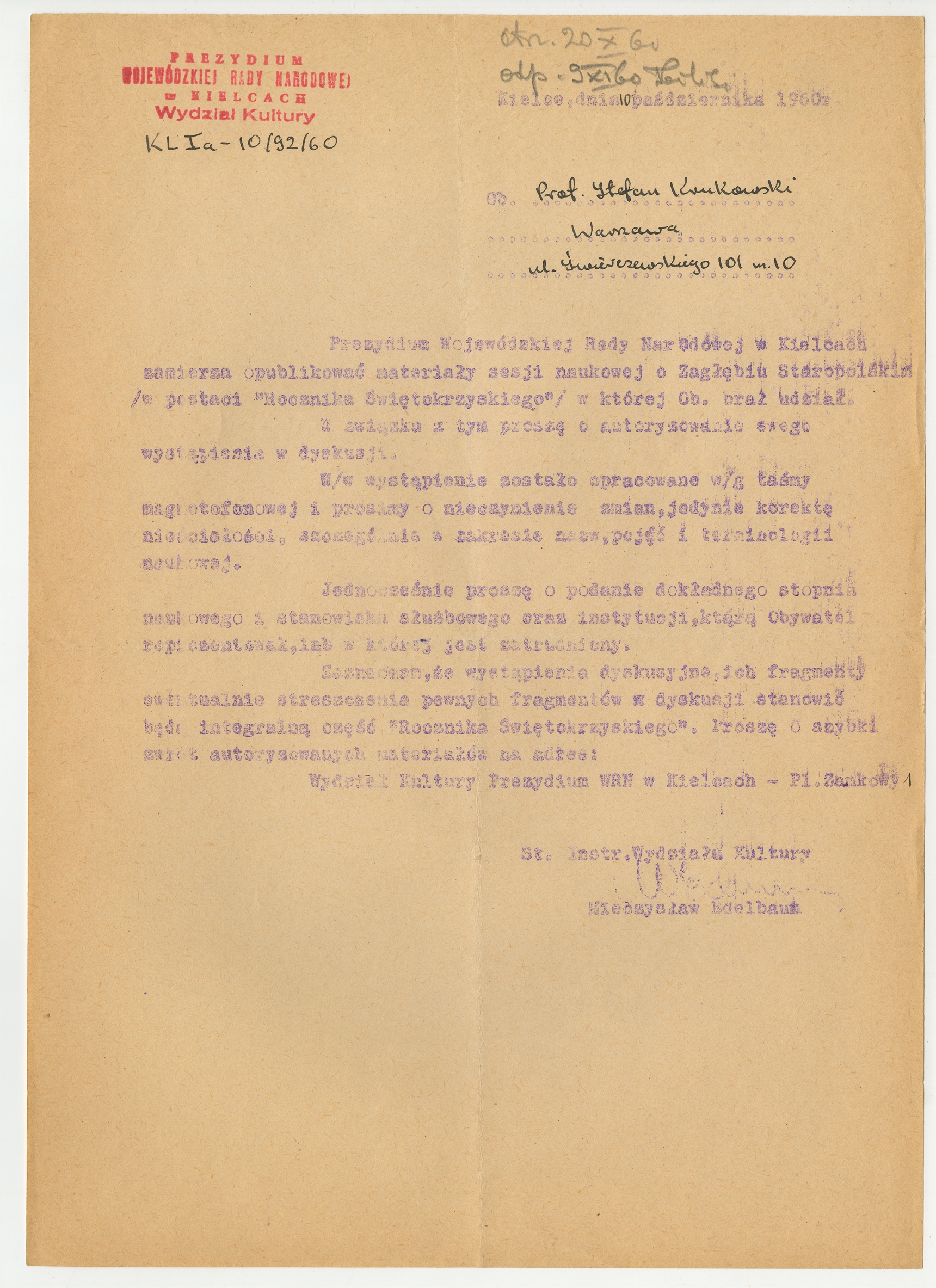 Maszynopis - list Mieczysława Edelbauta do Stefana Krukowskiego z dnia 10 października 1960 roku