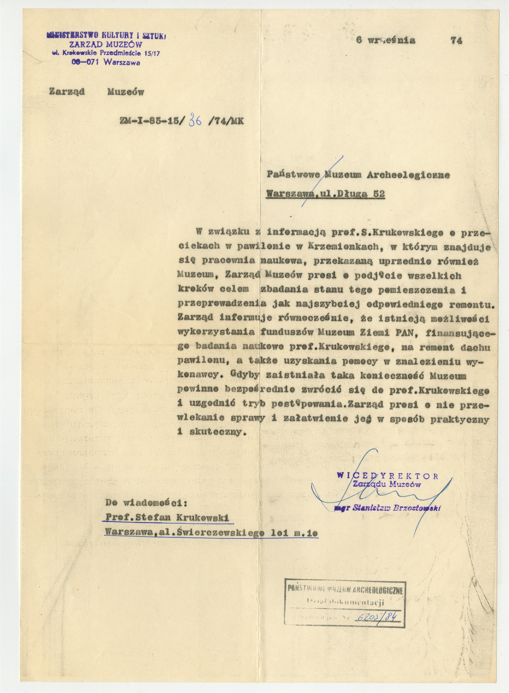 Maszynopis - list Ministerstwa Kultury i Sztuki do Państwowego Muzeum Archeologicznego w Warszawie z dnia 6 września [19]74 roku - kopia do wiadomości S. Krukowskiego