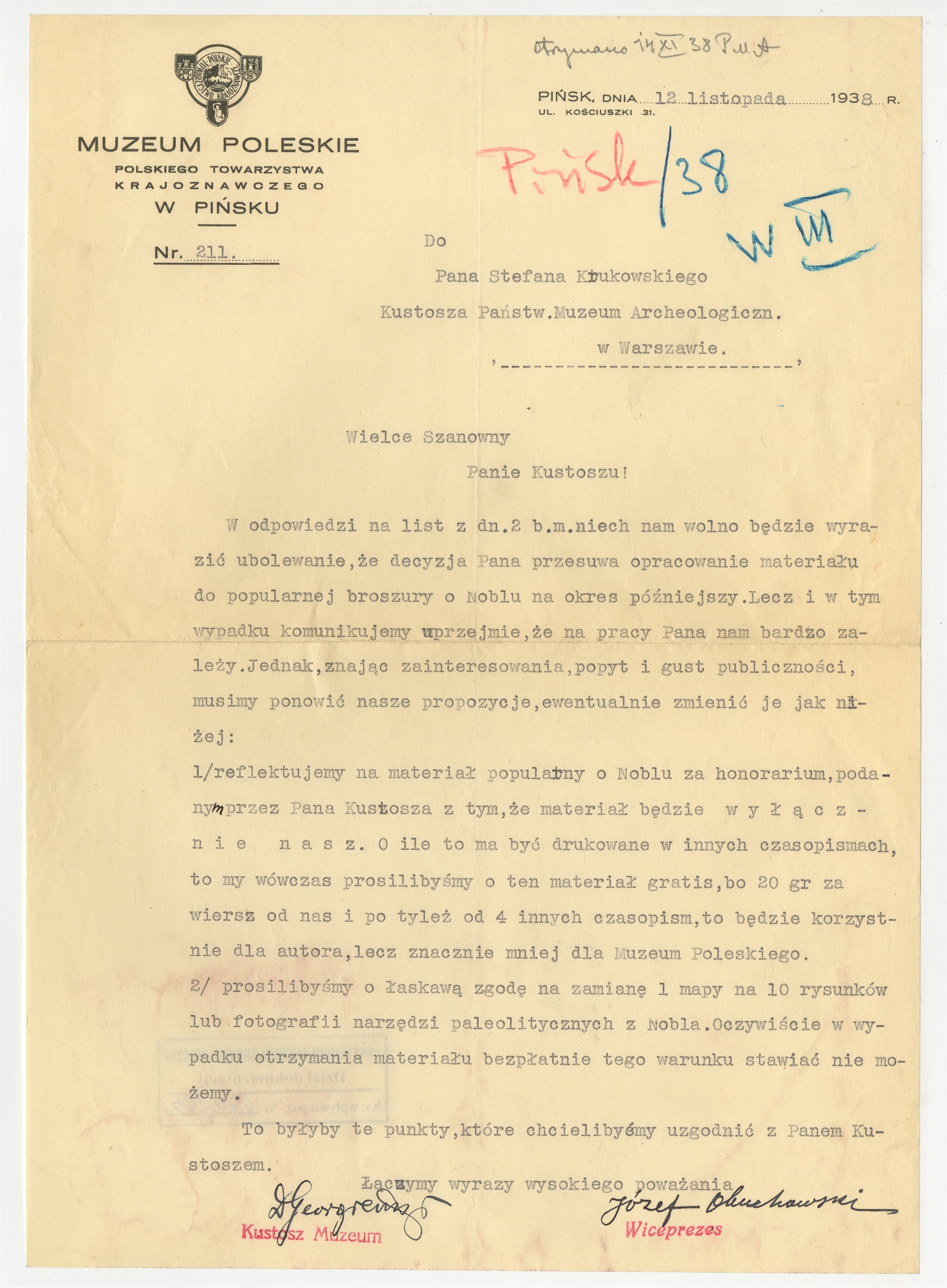 Maszynopis - list Muzeum Poleskiego w Pińsku do Stefana Krukowskiego z dnia 12 listopada 1938 roku