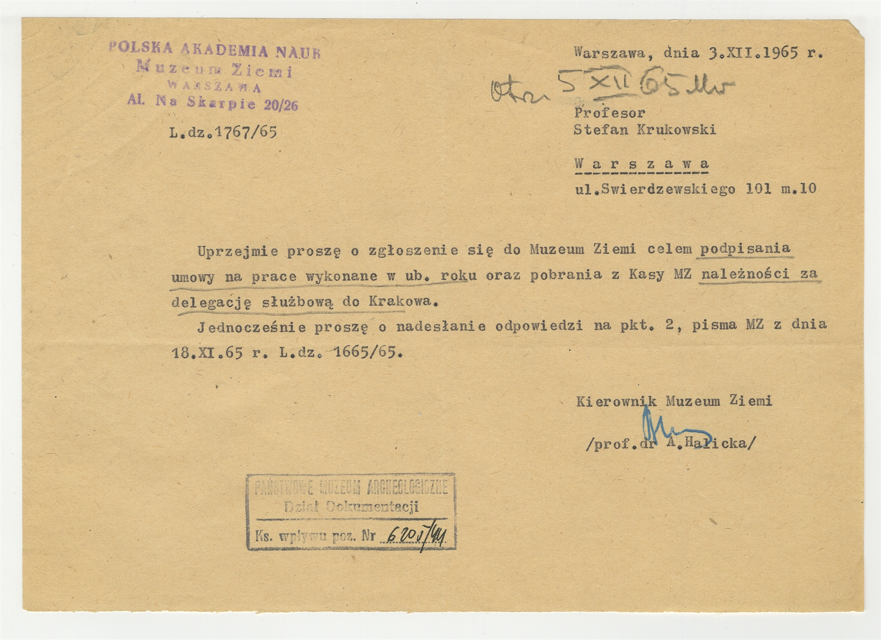 Maszynopis - list od A. Halickiej Kierownik Muzeum Ziemi PAN do S. Krukowskiego z dn. 3 XII 1965 r.