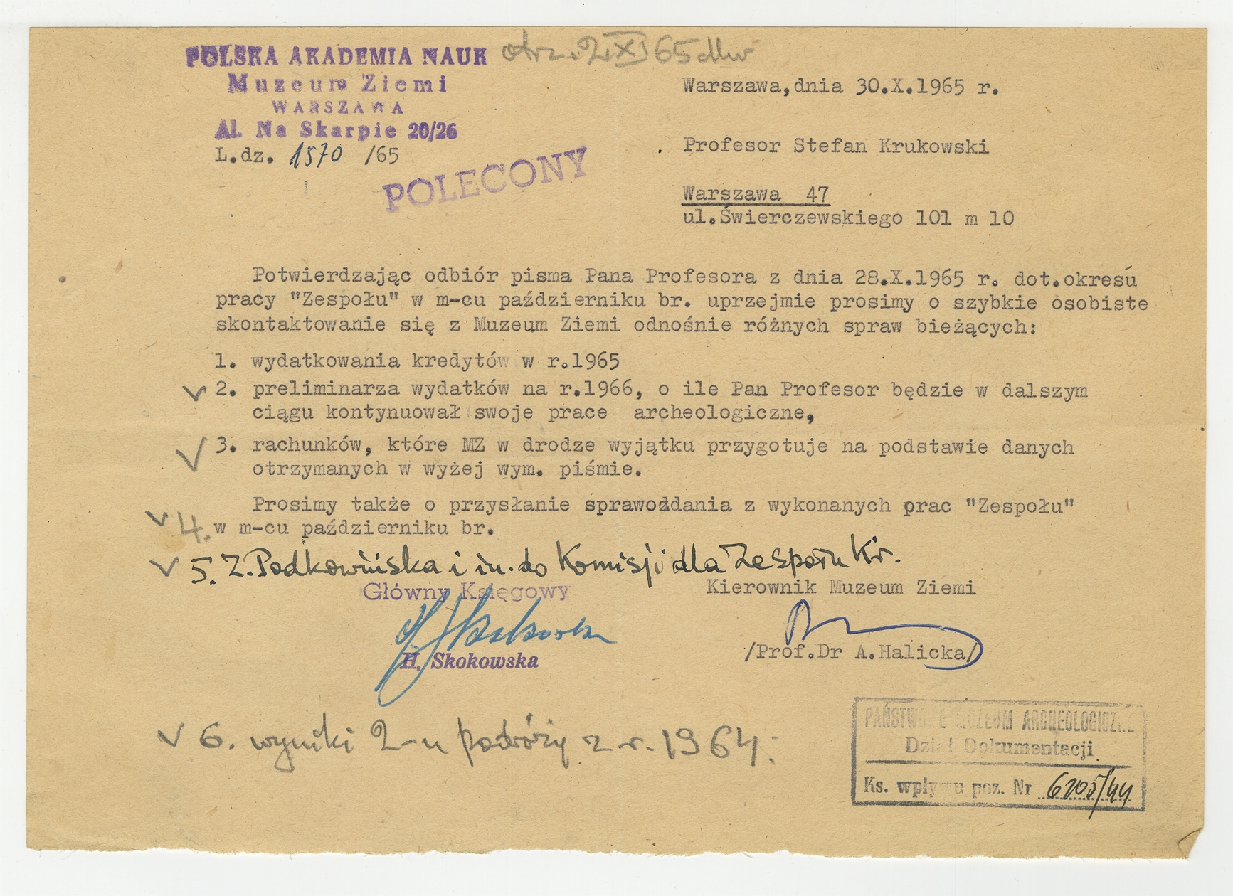 Maszynopis - list od A. Halickiej Kierownik Muzeum Ziemi PAN do S. Krukowskiego z dn. 30 X 1965 r.