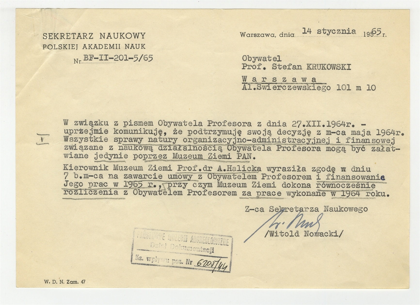 Maszynopis - list od W. Nowackiego Zastępcy Sekretarza Naukowego PAN do S. Krukowskiego z dn. 14 I 1965 r.