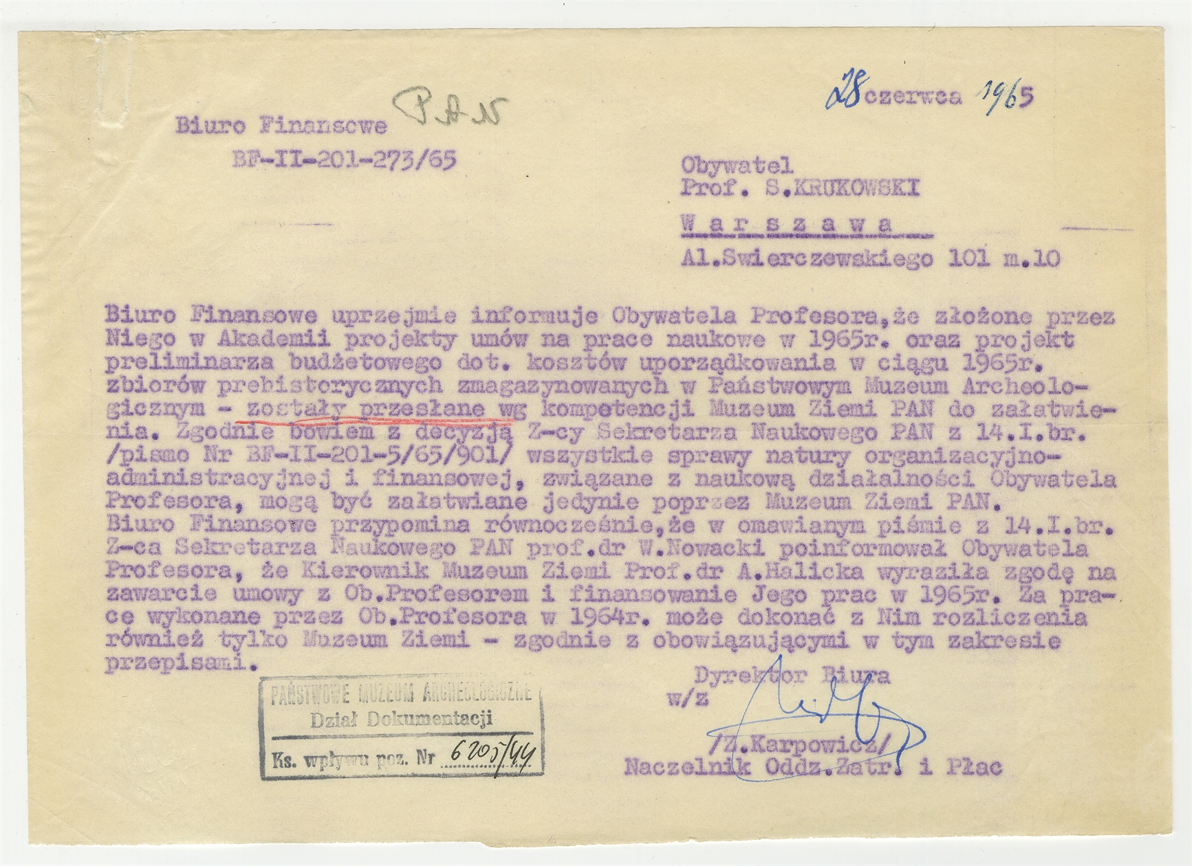 Maszynopis - list od Z. Karpowicza Naczelnika Oddz. Zatrudnienia i Płac do S. Krukowskiego z dn. 28 VI 1965 r.