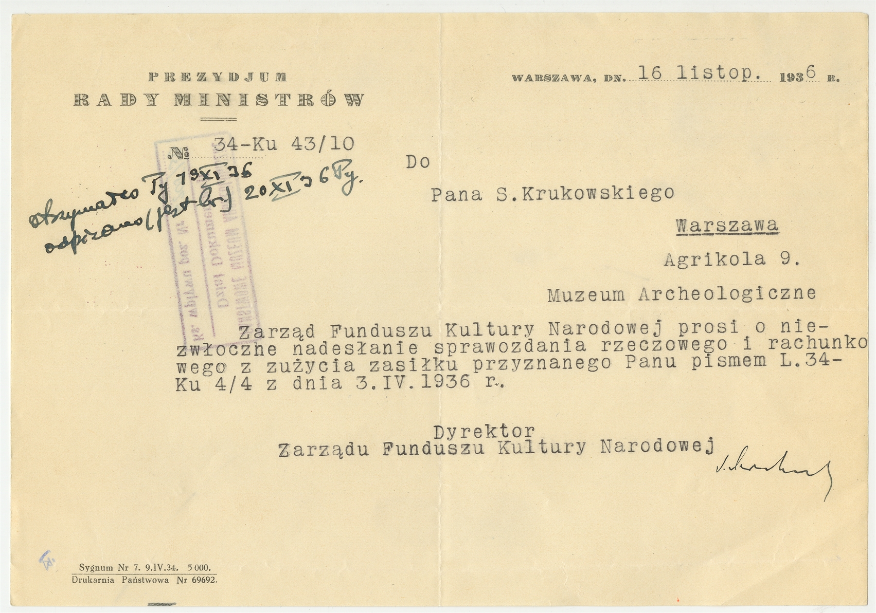 Maszynopis - list od Zarządu Funduszu Kultury Narodowej do Stefana Krukowskiego z dn.16 XI 1936 r.